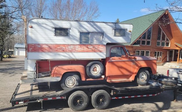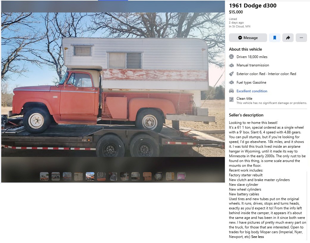 The photos of this heavy-duty Dodge one-ton pickup and vintage camper aren’t the best, sadly. I’m not sure why, but it is what it is, as people say. It deserves better, but this 1961 Dodge D300 with a Vista Liner camper is listed here on Facebook Marketplace in St. Cloud, Minnesota, and they’re asking $15,000. Here is the original listing, and thanks to T.J. for the tip!