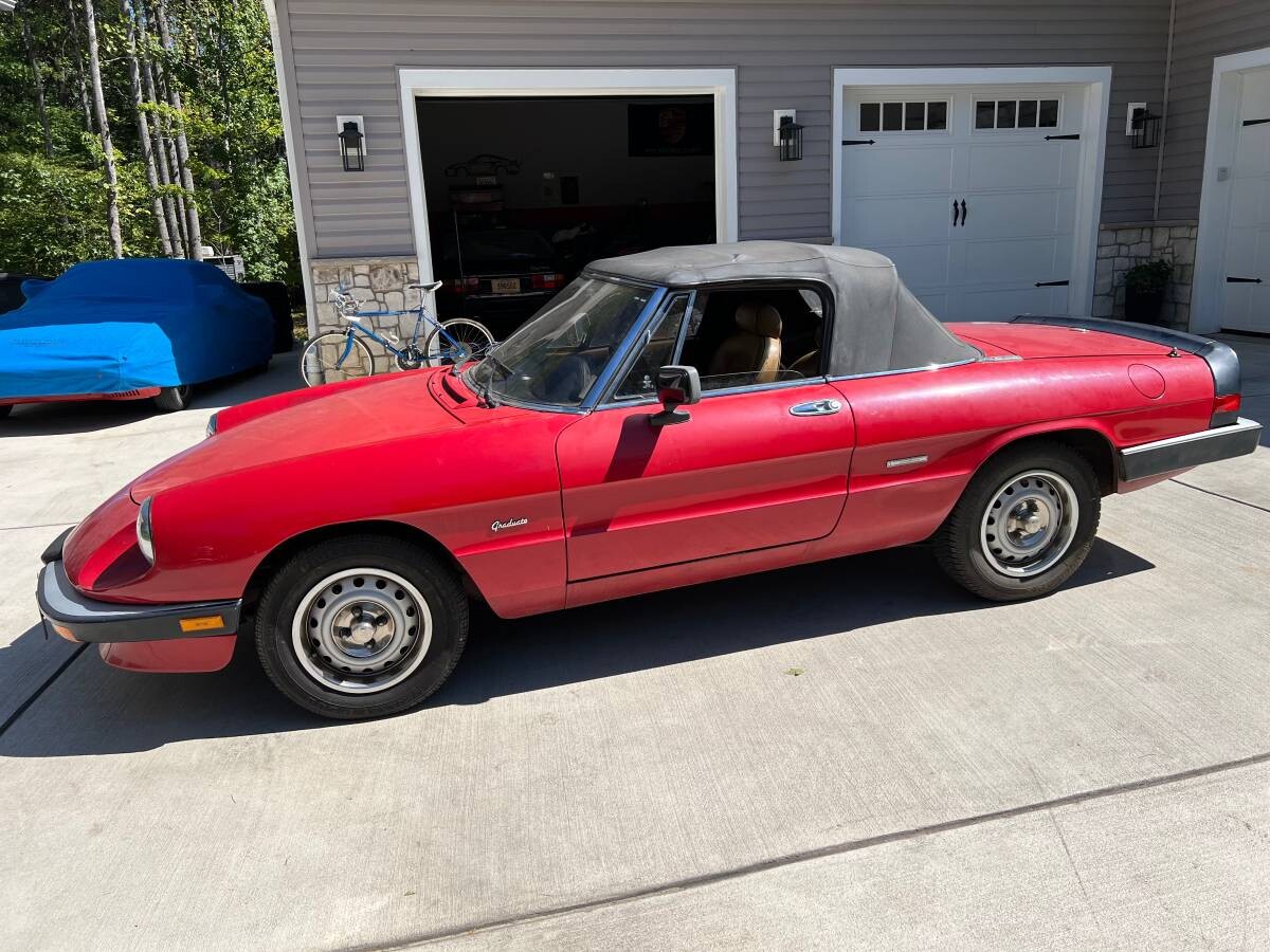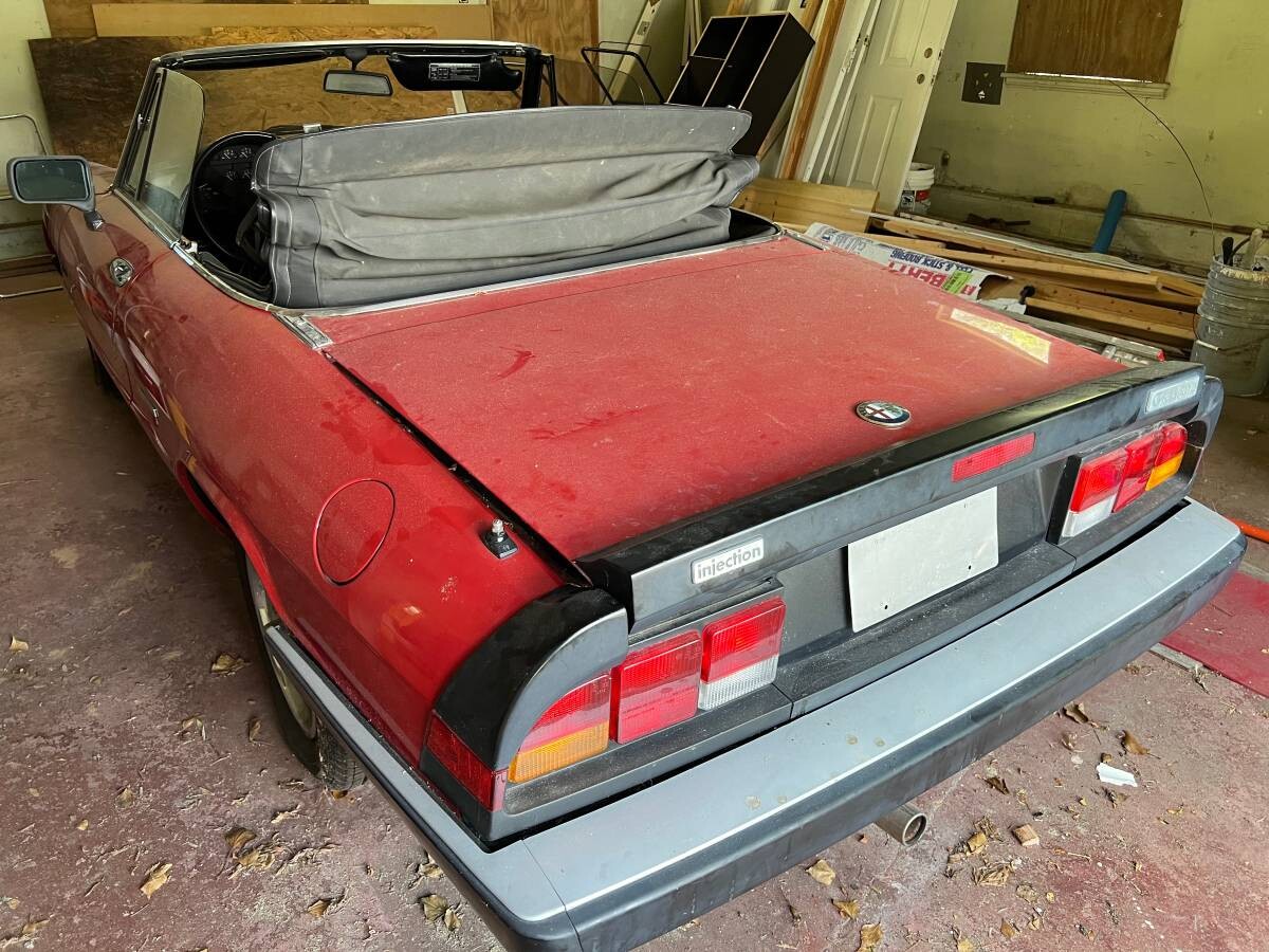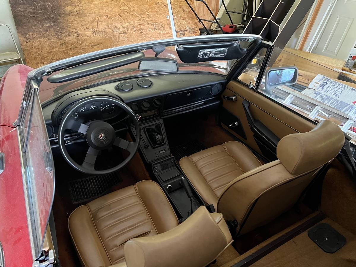 The as-discovered photos are a treat, and this shot of the tail lends further credence to the mileage: look at how lustrous the black plastic “stripe” is on the hindquarters, and the same goes for the antenna surround. The bumpers are likewise quite radiant, and those surfaces tend to tarnish after years’ of sun exposure. The seller has gotten this Alfa to run but notes it still needs some fine-tuning; even so, it seems to be a legitimate chance to own a near-new “Graduate” Spider.