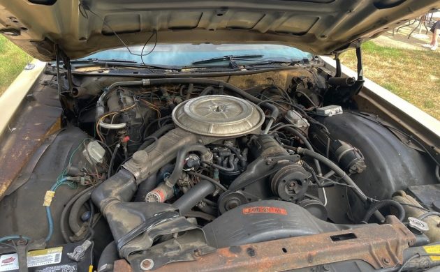 The dusty Ford 400-cu.in. V8 is oily underneath, but despite that, it had 160 horsepower and 320 lb-ft of torque when new. Sent through a three-speed automatic to the rear wheels, this one is said to have 98,000 miles and runs and drives well. Are any of you fans of the last of the giant Country Squire wagons?