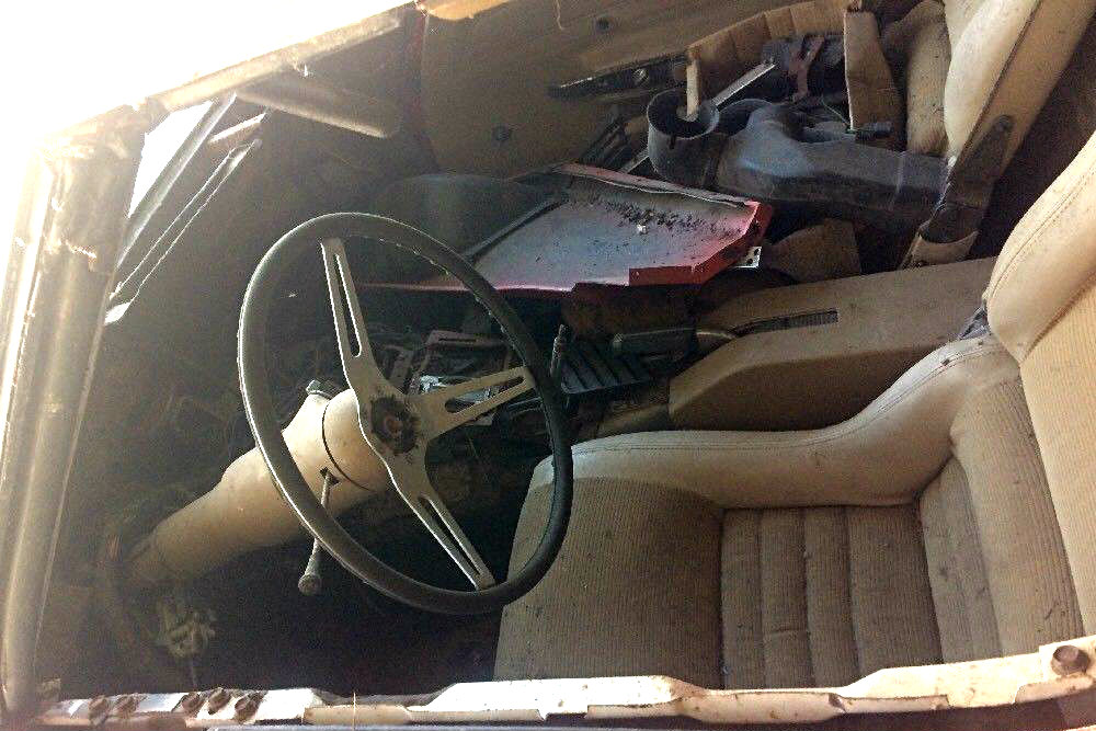 Although the interior is a bit hectic, the tan interior components are in decent shape. The seats, doors panels, and center console all look reasonable, but most of the dash is missing. There is an array of parts inside of this corvette, so it is difficult to categorize what may be missing from the interior.