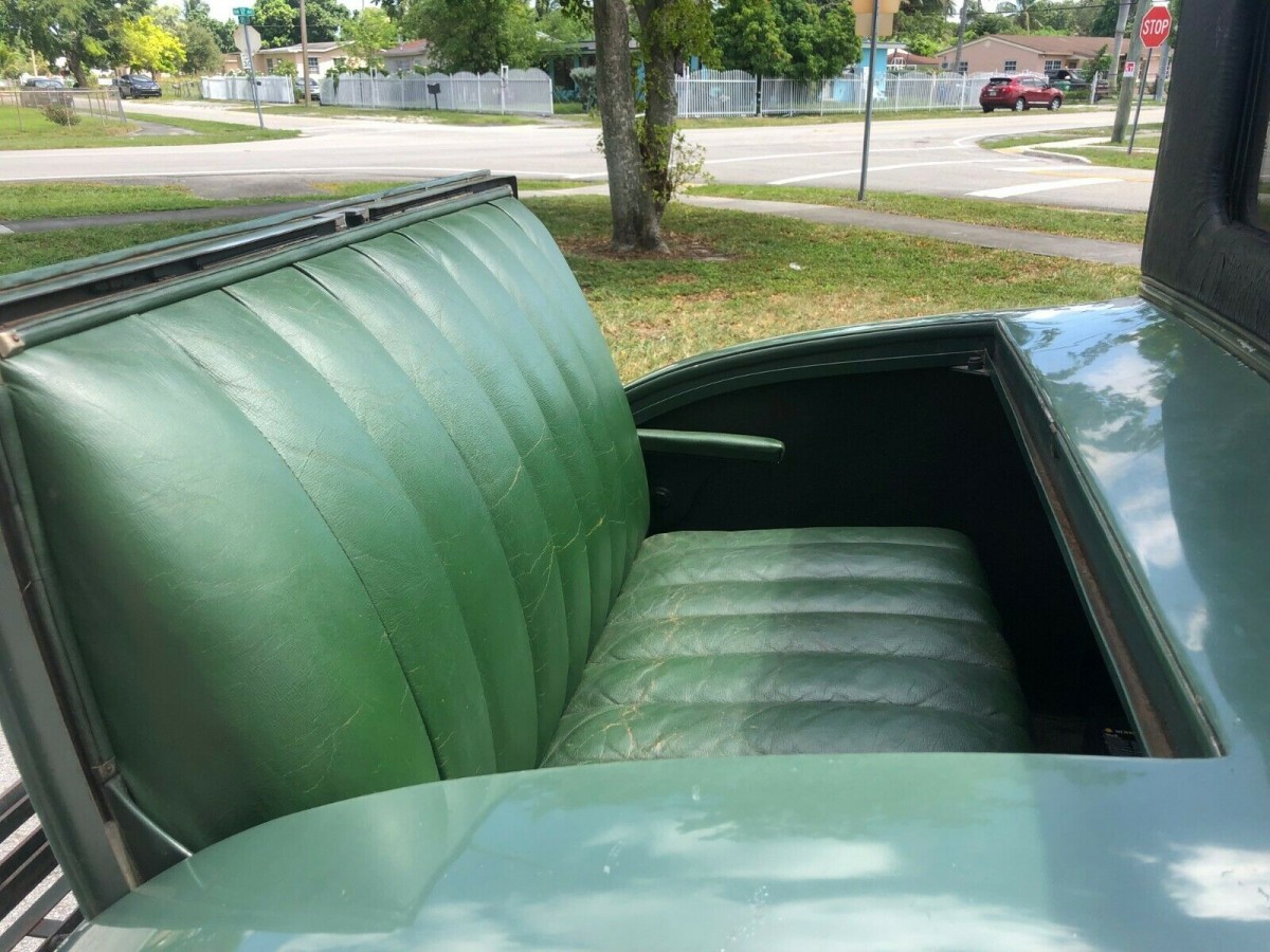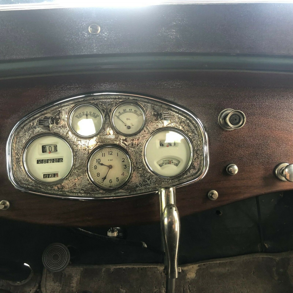 The originality of the Stutz carries over to the interior, with the seat and door trims still wearing their original mohair upholstery. The seat is looking a bit moth-eaten in a couple of places, but it still looks to be solid, with no signs of rips, tears, or rot. During its 70-years in storage, the rumble seat was kept closed, and the original green leather upholstery on it has remained absolutely faultless. The timber on the dash appears to also be close to perfect, but it is the gauge cluster that really embodies all that is special about this car. You get a nice selection of gauges, finished in black on a cream background. However, it is the surround that can’t help but grab your attention. If you look through the photos at the bottom of this article, you will see a lovely photo of this feature. It is the most ornately decorated piece of nickel, and its intricacy is enough to take your breath away. By the way, that odometer reading of 8,796 miles is said to be original.
