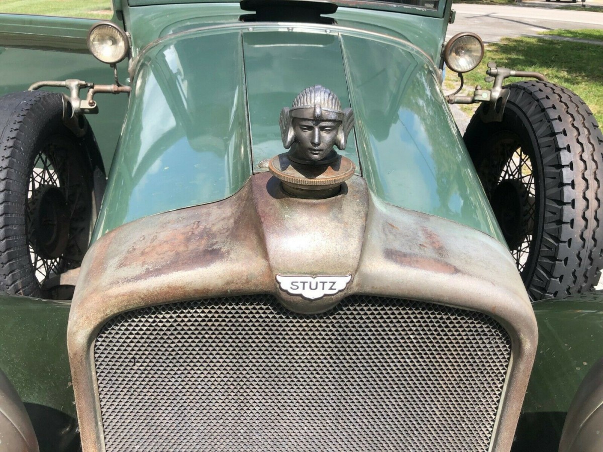 Part of the secret to the preservation of the Stutz is the fact that it spent something like 70-years hidden away in storage. The same family had owned the car from new right through until it was sold in 2001. As you study the car it is incredible to think that all of the green paint, the black top, the chrome and trim, and the wire wheels, are all original and unrestored. The car is showing its age, but it seems that no-one has been willing to disturb the vehicle’s originality by undertaking a restoration. As far as rust issues are concerned, there are none. The owner supplies photos of the underside of the Stutz, and it is spotlessly clean. Some of the key features of the car include the rear-mounted luggage rack, the matching spare wheels mounted on each running board, the rumble seat, and the pioneering use of a new form of safety glass. If you look closely, you can see fine parallel wires embedded into every piece of window glass as part of the manufacturing process to improve safety. The thinking was that even if broken, the glass would maintain its integrity, rather than shattering into sharp and dangerous shards. The 1928 model year marked the first for Stutz with this innovation included in their offerings.
