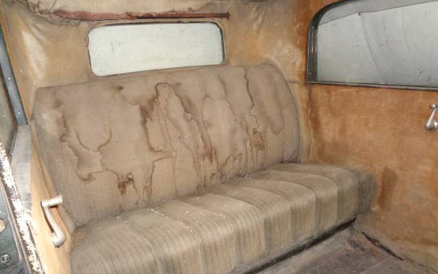 I had a similar 1932 coach. With the fabric top insert, just with age, those will leak like crazy in the rain, so if this car was parked outside just a little, that would explain the stains.