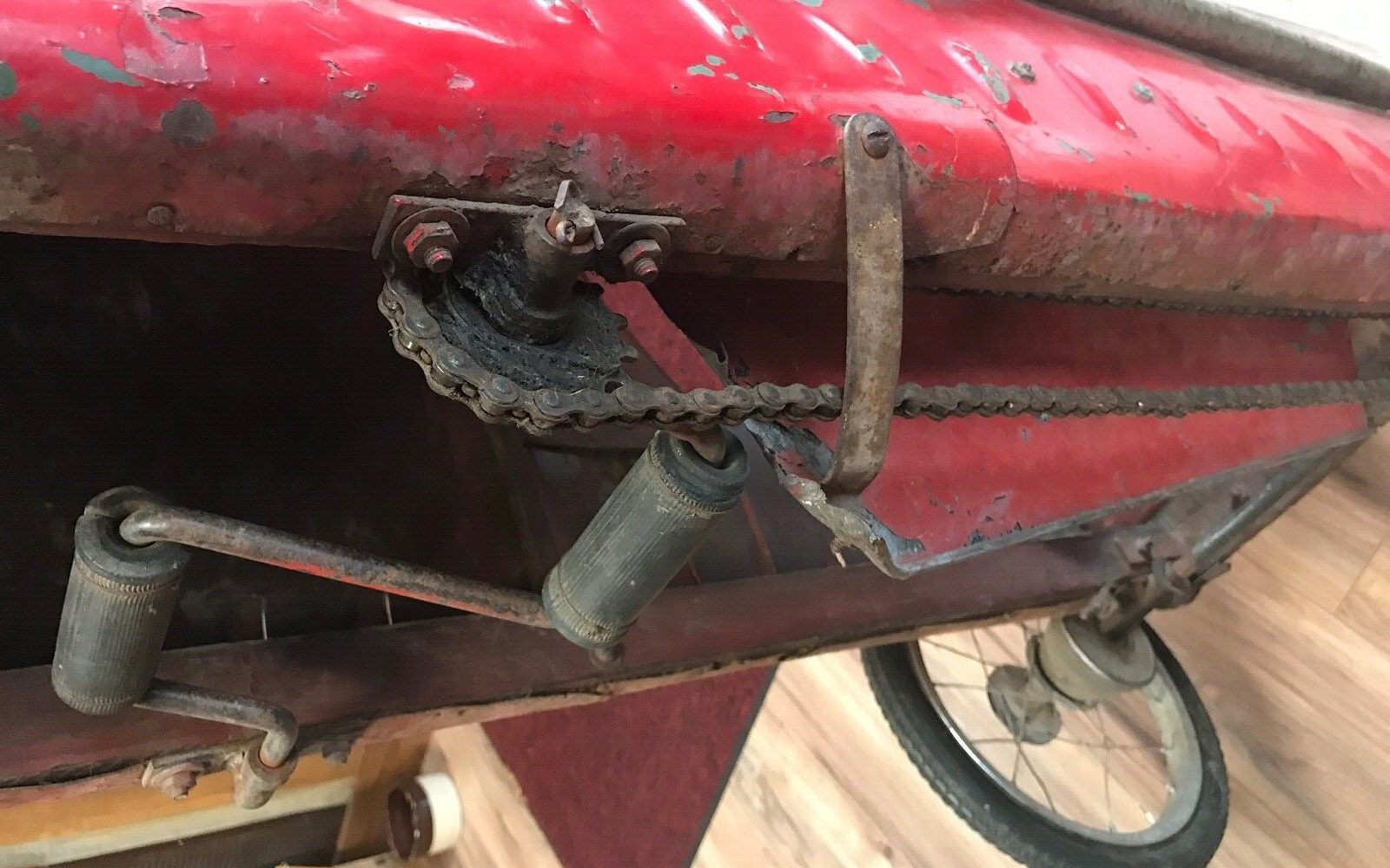 Here you can see the pedal and chain assembly. It’s clear there is some rust underneath, but it doesn’t look too far gone. The ad states that at some point someone added a battery tray and lights. Normally modifications to a pedal car would hurt the value, but with this car being a one-off, it probably doesn’t make a difference. In fact, it probably looks awesome with the lights on!
