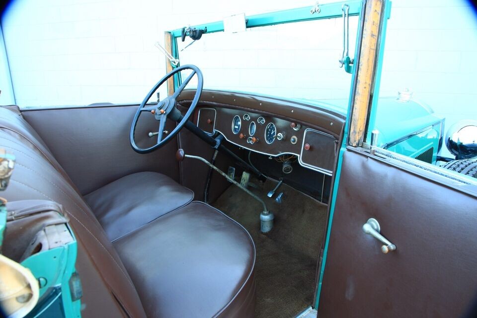This is where we live, the well-appointed cabin. The steering wheel was a four-spoke affair in the early ’20s; the new style called for a three-spoke. This Standard has a wiper for the driver only; the Deluxe supplied a passenger’s side wiper as well. A vacuum-activated lubrication system controlled by the driver took care of the chassis in “real time”, easing service requirements. Adjustable shocks were available, and of course, four-wheel brakes had finally become standard. This car’s upholstery is wrinkled in a few areas, and the paint has worn off the gearshift lever and the window surround – nothing we wouldn’t expect from an aged restoration.