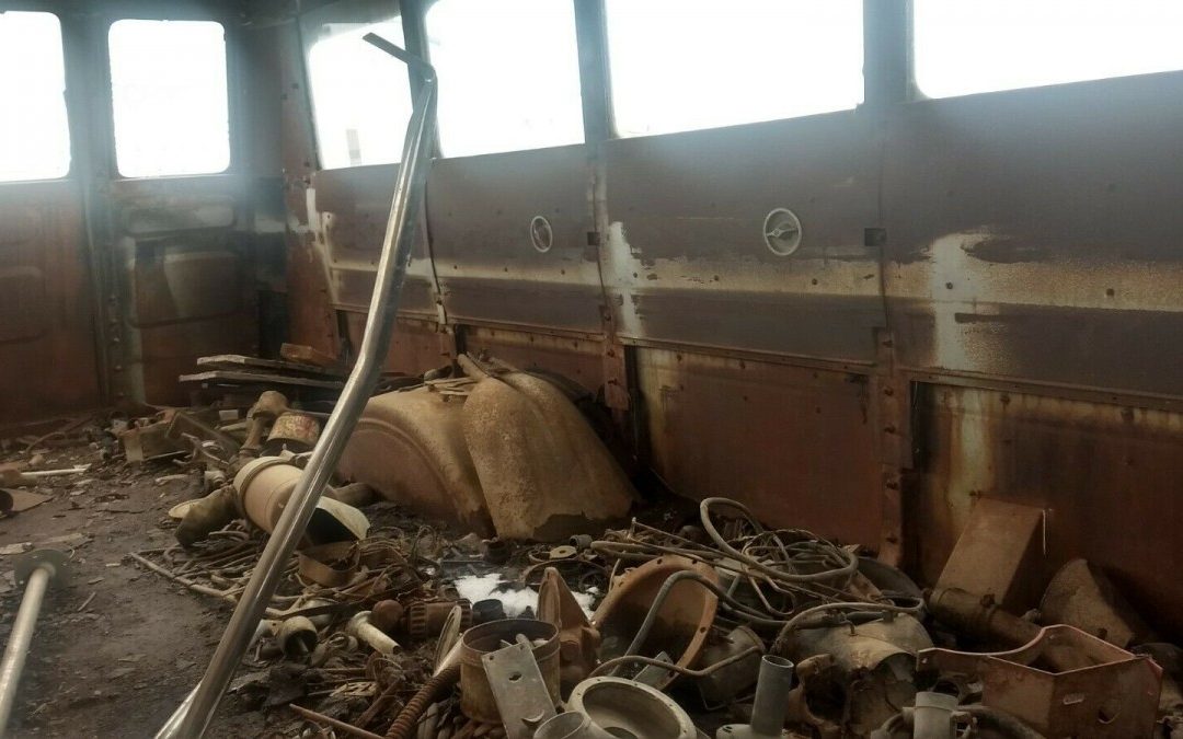 Here you can see the back of the bus is storing some rusty relics. The cargo area is just large enough to have multiple uses, but overall, the bus is short enough to be driven easily. You could easily put three or four rows of seats. How about a couple of couches, fridge, etc.? Maybe a fold-out bed with kitchenette? What would you do if this was your project?