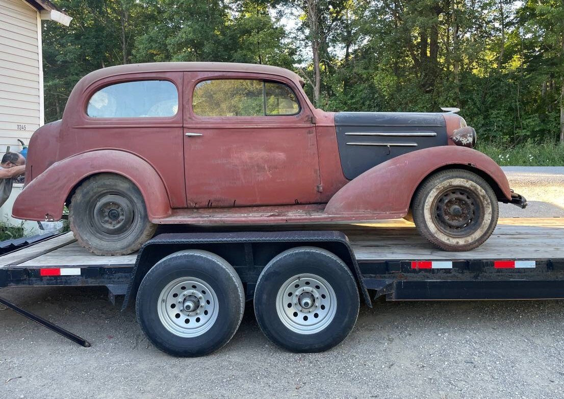My first car was a 1936 Chevy Standard two-door. The Masters featured chrome headlight buckets and chrome trim along the hood louvres. The car in question does not have chrome headlight buckets but appears to have the chrome louvre trim. My Standard lacked these features and did not have a temperature gauge. In 1936 Chevy offered both independent front suspension (which Chevy called “knee action”) and a straight front axle. My Standard had the latter, and my Dad told me I was lucky for that.