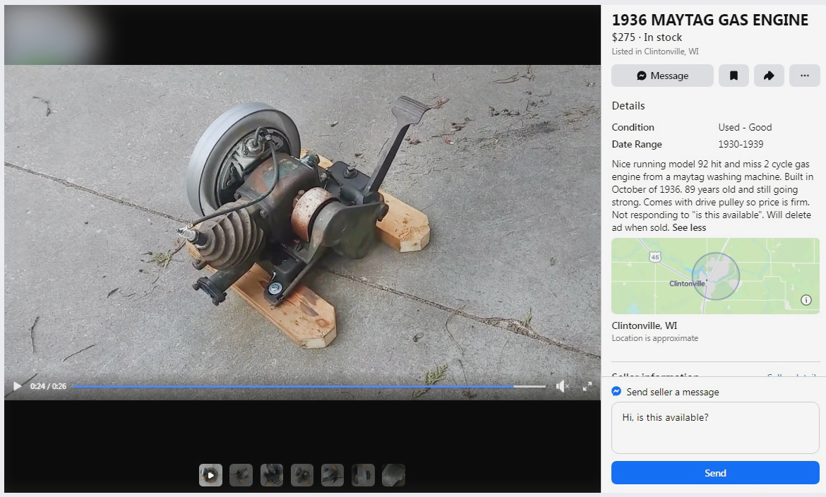 Central Wisconsin thresherees have a robust hit and miss engine community. This is the only offering on Barn Finds that has fewer than 8 cylinders, hence the only one I’m interested in.