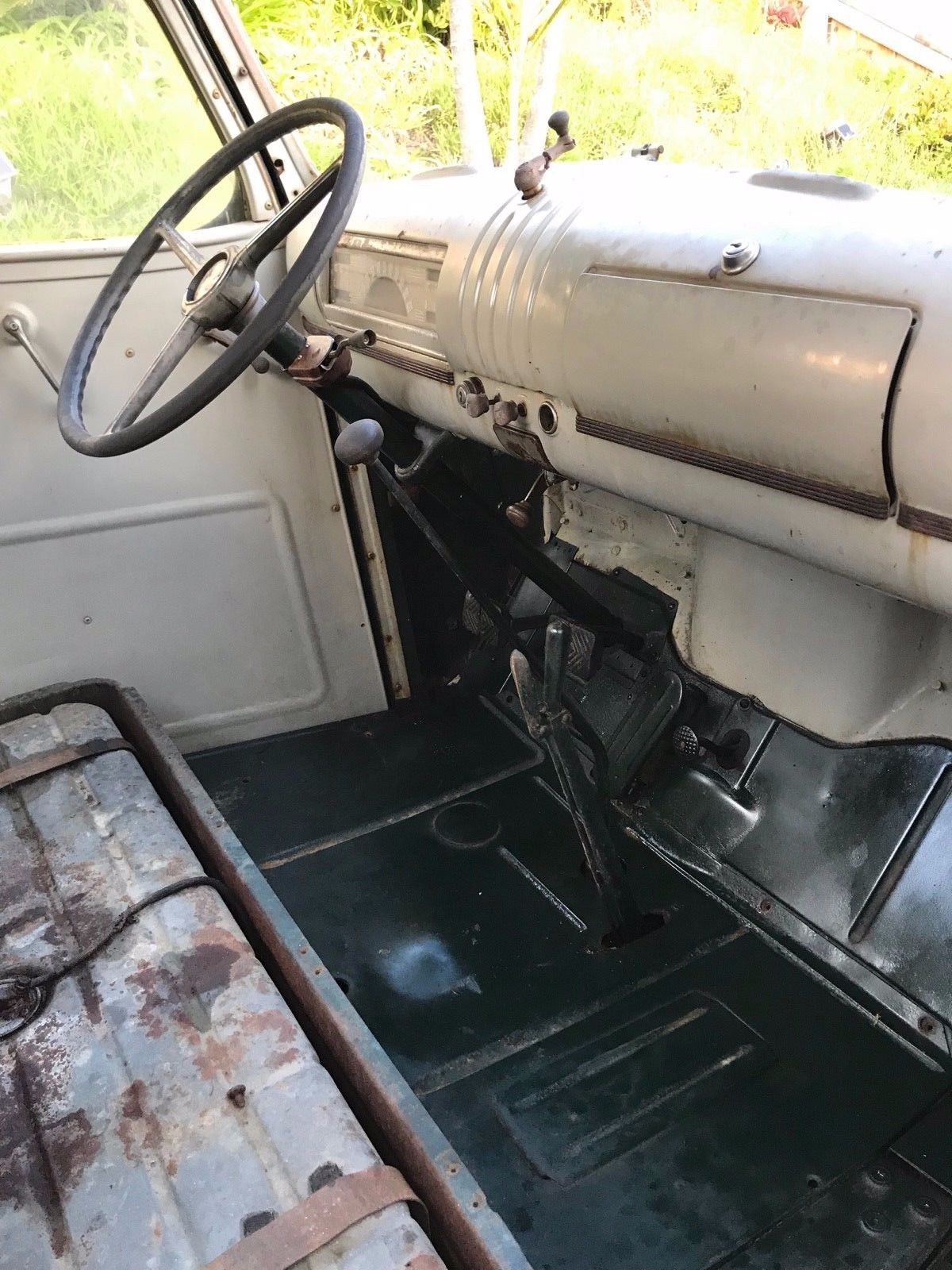 Inside the cabin looks like it has been worked on before. Not all the paint colors match and the floor is green but the dash and doors are white. Maybe this was how they did it back then, I’m not sure. With the windshield missing, thankfully the truck had been stored in a barn. There is probably more to this truck than pictures can show.