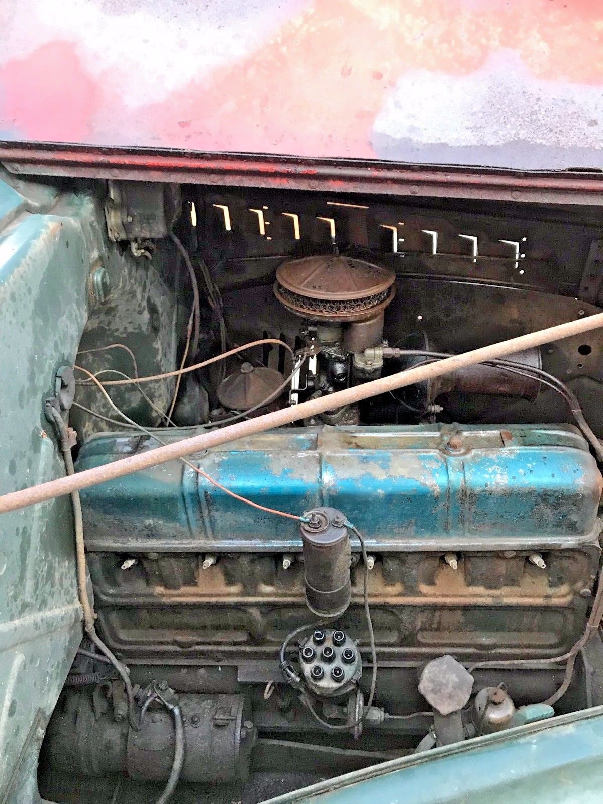 Under the long, narrow hood sits what could be the original straight six engine connected to a manual transmission. It currently does not run and drive but does roll and turn as noted a few times in the listing. Based on the pictures it seems to be missing engine components. The listing does state it has a 6-volt system.