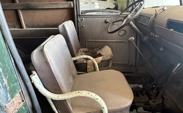 The interior has a set of funky non-original seats that tilt forward, a clever alteration that probably made removing items from the front of the cargo area easier. Speaking of the cargo bay, I love the barn door configuration. Some will find the vintage advertising charming as well. The instrument panel is plain as can be, with basic gauges on offer in an unfussy display.