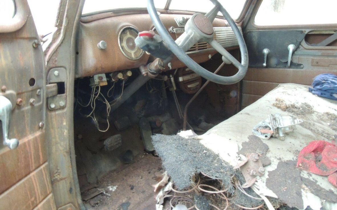 As for body integrity, we are advised, “some rust in the usual places”, not sure how that translates with an Advance-Design truck. It seems to have surface rust, and a whole lot more, all over the place so “all over” must be typical. We are told that all of the window glass is intact but at first glance, it doesn’t appear to be particularly useful as it seems fogged and scratched. I have to admit that the windshield sunshade is a nice addition but it is not believed to be original to this truck, not that it matters. And then there is the entire issue of what to do with the open rear frame – the world is your oyster, I guess.