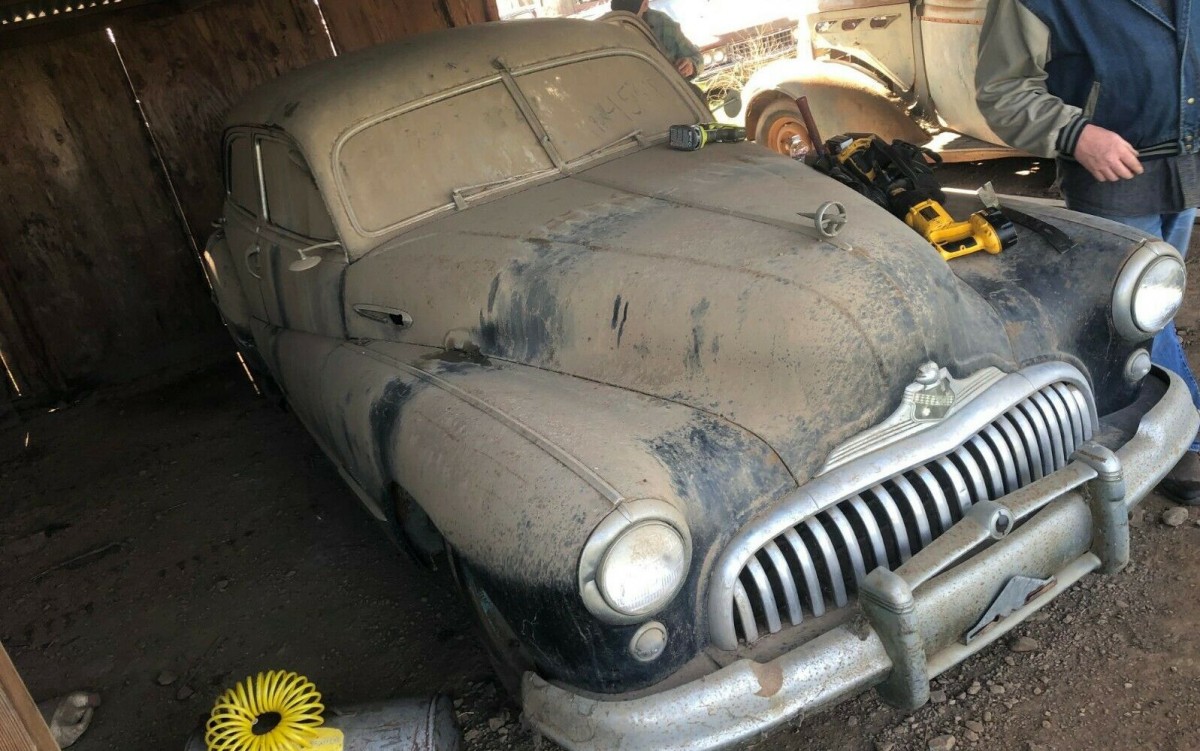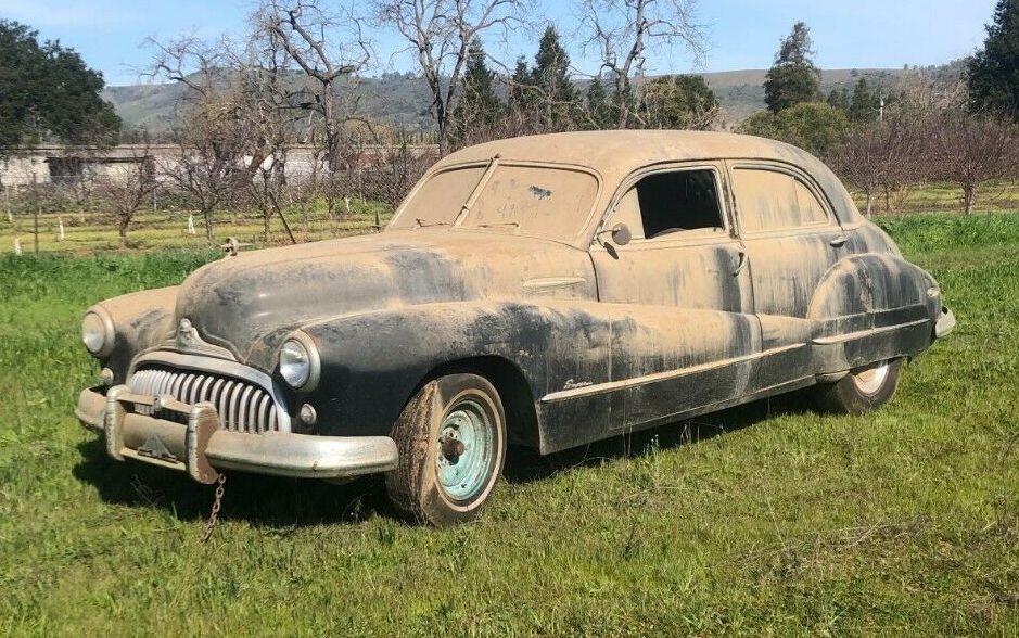 From 3/2/20 – A few months back, I reviewed a nicely preserved 1948 Buick Super coupe. It was a mostly original car that had received a non-original two-tone paint job. For comparison purposes, we have discovered a four-door sedan version of that Buick and is a true barn find, covered in 35-year-old dirt no less, and located in Riverside, California. This untouched 1948 Buick Super is available here on eBay for a BIN price of $6,900 with a “make an offer” option.