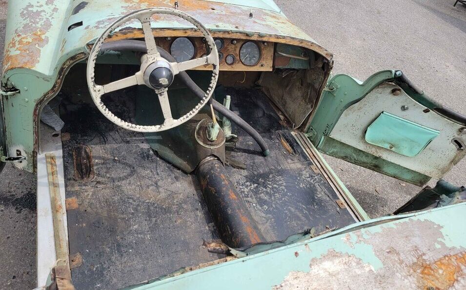 Not much to review regarding the interior, its stripped. The seller states that he has “the” seat frame, with emphasis on “the” and not both – an inquiry will need to be made. The gauges appear to still be in place but there’s not much that can be said, at a distance, about their condition, appearance, etc. Same with switchgear, it all may or may not be present. These are simple and austere interiors but this environment is going to require just about everything to be useful again.