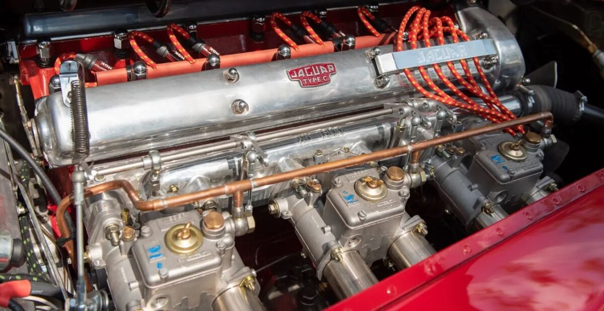 The motor is Jaguar’s venerable six-cylinder, OHC 3.4 liter motor. When paired with a C-type head from a Jaguar XK120 and two SU carburetors, the horsepower was around 210. This motor does have the C-type head, but of course, the triple Webers changes the equation. The Weber treatment wasn’t unique to this car, of course. Around the same time as this car was a twinkle in its owner’s eye, the Heuber Roadster came to auction. Take a look at the Heuber’s engine bay and tell me it doesn’t look awfully familiar.