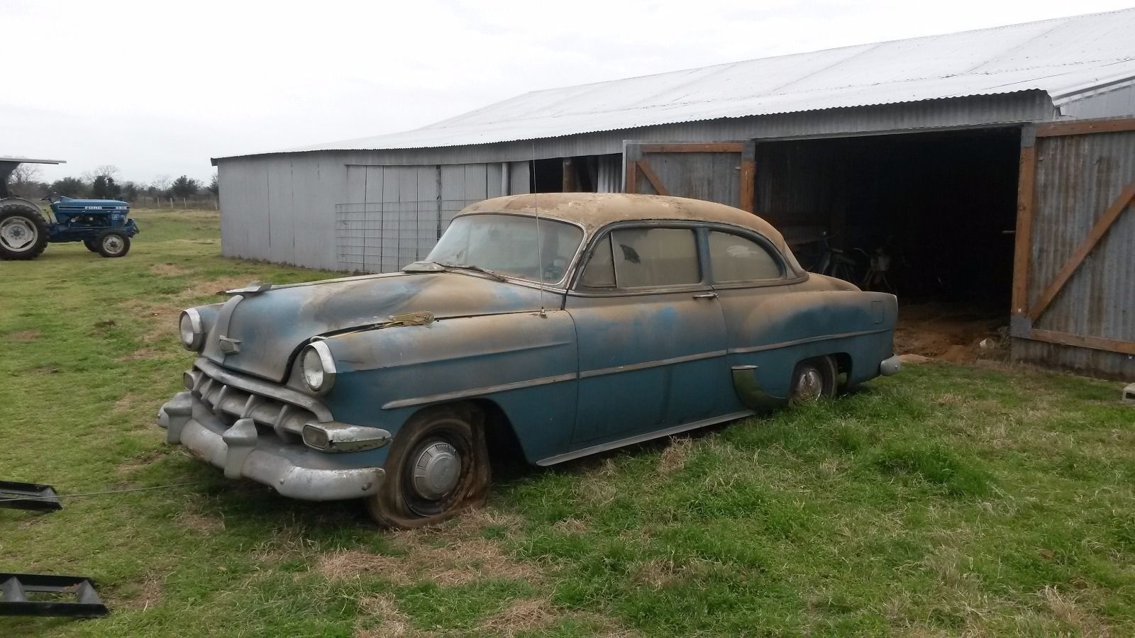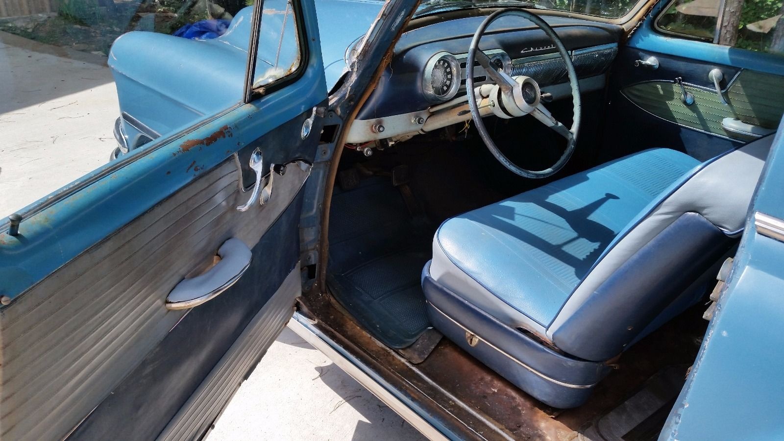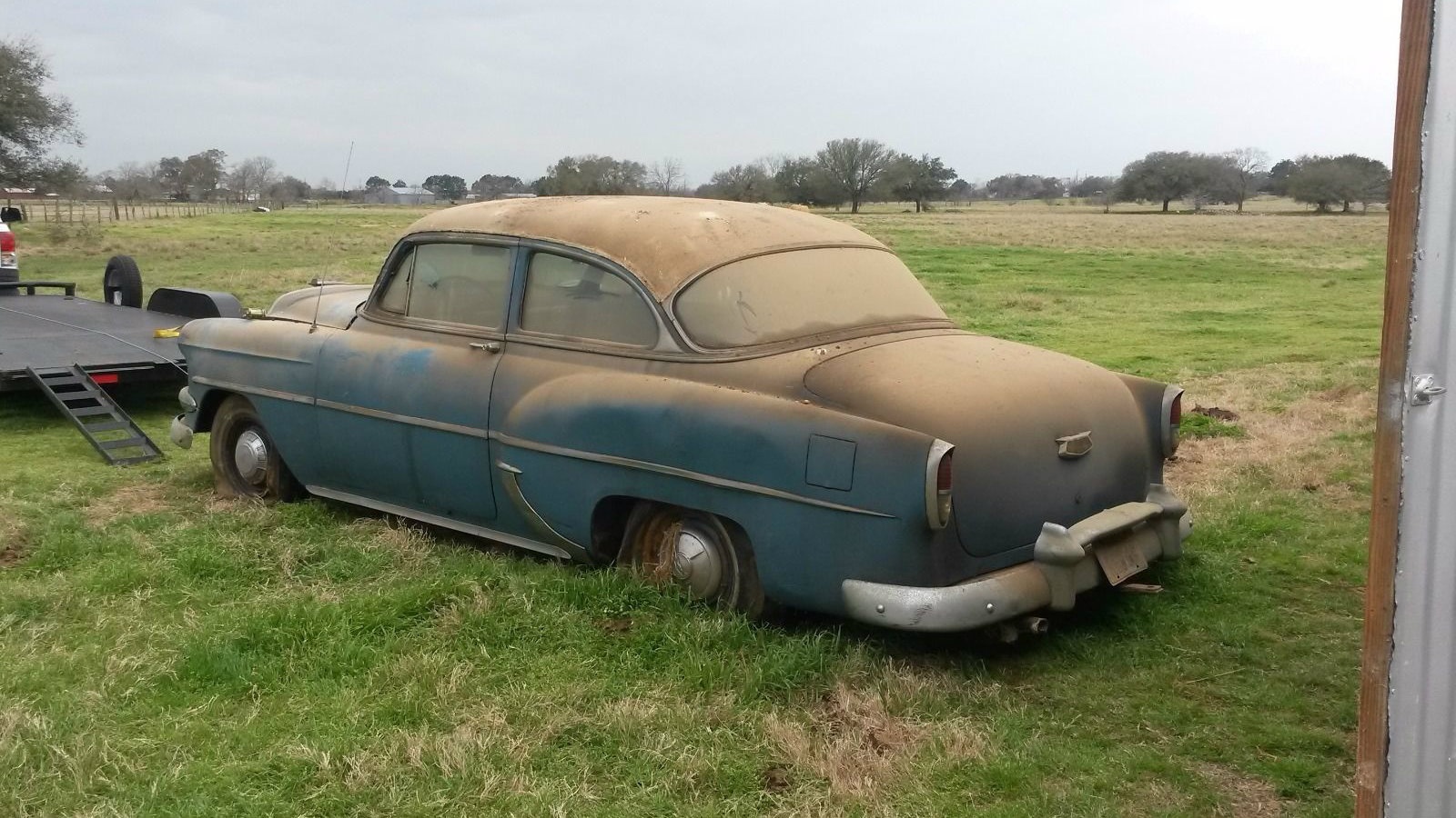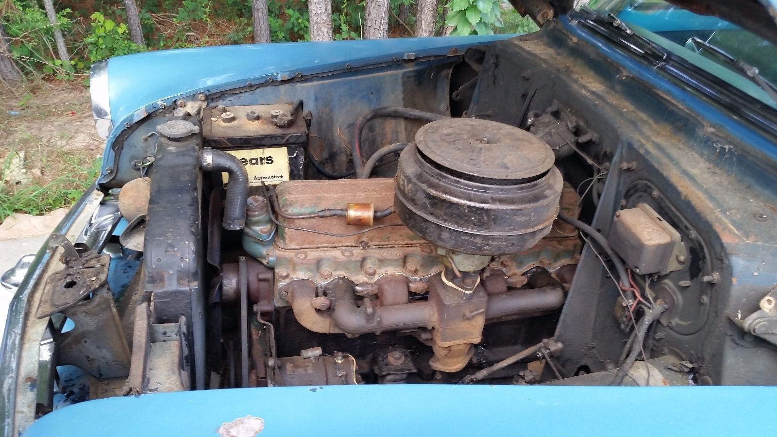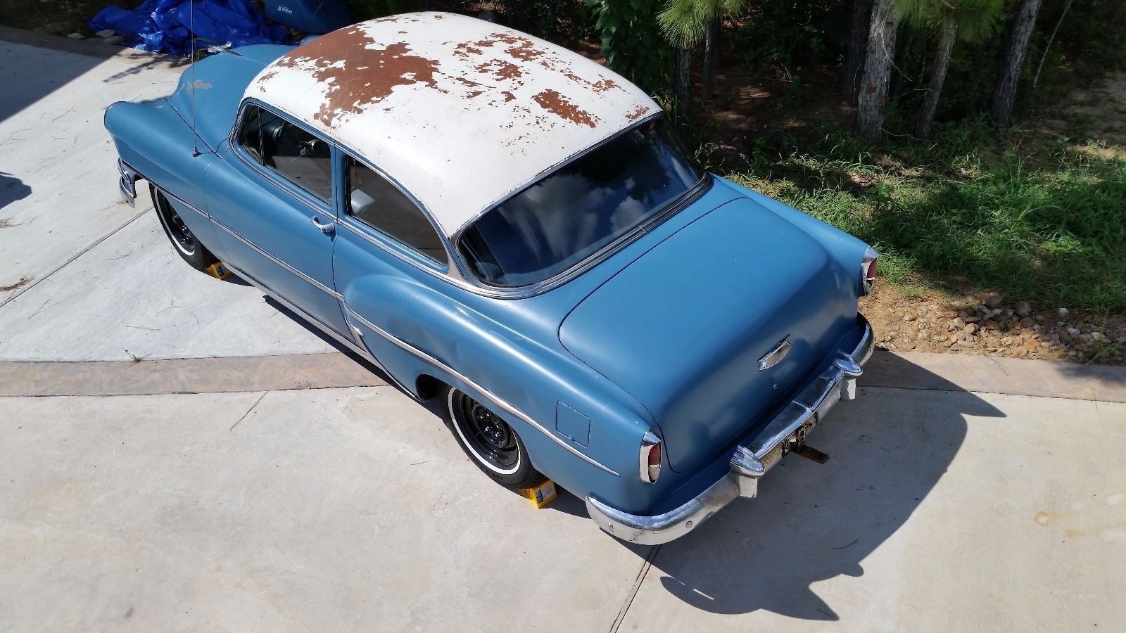 I don’t think the existing frame looks beyond salvaging, however (!) I owned my first and only ’54 Chevy 235/3spd quite recently and honestly found the gearing alarmingly low. At 50+ mph I would keep one eye on the transmission hump expecting the seemingly inevitable day shrapnel from the tranny would explode through the floor and sever my leg…these cars look nice but aren’t honestly practical as-is in my opinion. Primitive suspension, torque tube driveshaft, low gearing, 6 volt system, etc…I also found many of the aftermarket parts to be substandard. The repop hood and trunk emblems for instance quickly faded on a car that I religiously kept garaged. These cars are like cats, best appreciated when they belong to someone else.