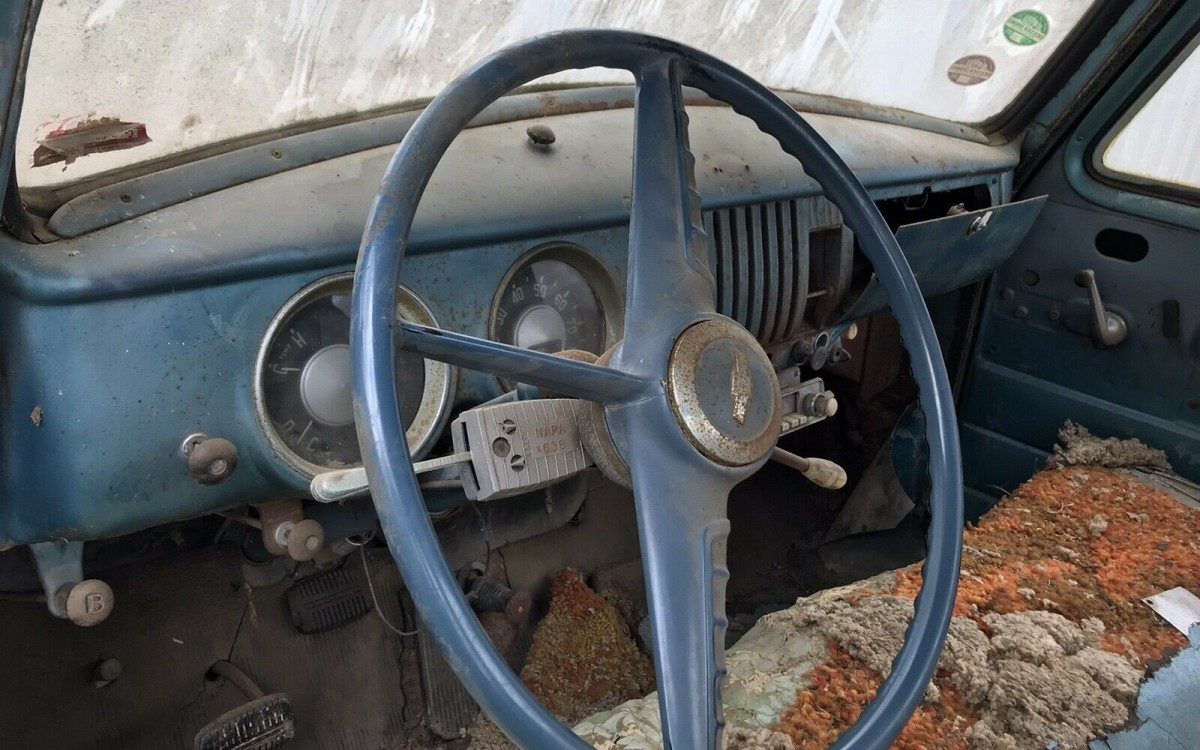The interior appears to be all original with the exception of a radio peeking out from under the dash. The seat appears to have been ravaged by some critters, but replacing upholstery is not too bid of a deal. I’ve always liked the gauge design on these trucks. The two-round gauges are nice and symmetrical and the gauge that houses the temperature, oil pressure, and fuel is a great design.