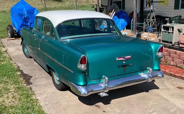 Advertisers have historically overused the term “all-new” when marketing a car with a new grille, new badging, or sometimes nothing new at all. In 1955, Chevy had a right to make the claim that “everything’s new!” In addition to a completely new body and a new optional V8 engine, the Chevy had less exciting features such as a 12-volt electrical system, suspension improvements, and updates to cabin ventilation. The standard six was, however, basically a carry-over from the previous model year; it’s the 235-cubic-inch version of Chevy’s “Stovebolt” with 136 horsepower when teamed with Powerglide, as it is in this “Neptune Green” sedan. As with this past week’s Bel Air Sedan, this car has had a splash of white on the roof to add a little contrast, a common and relatively easy-to-make upgrade.