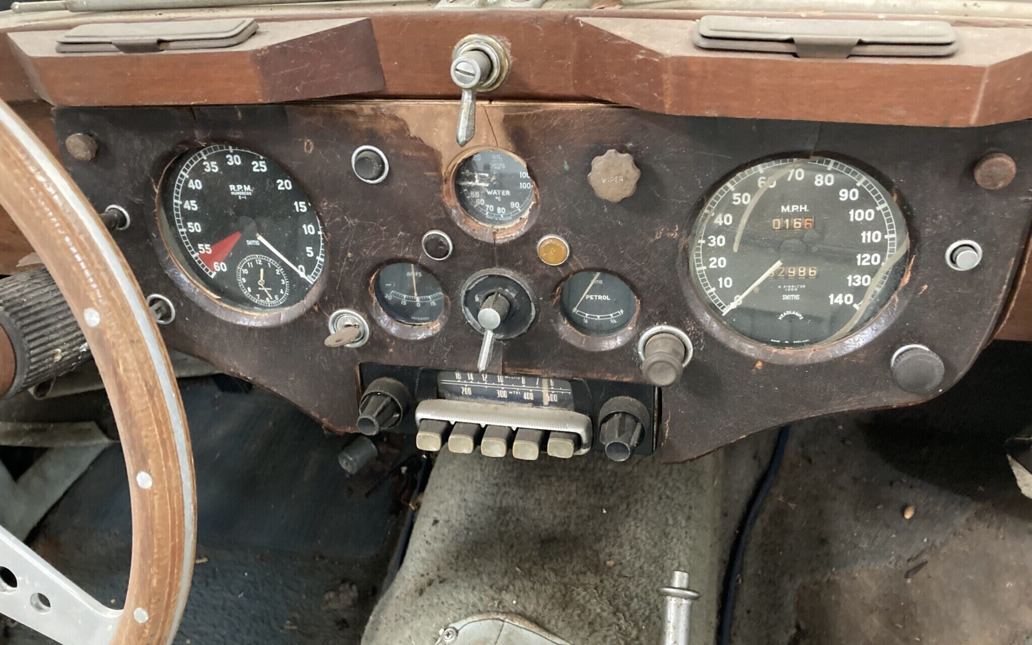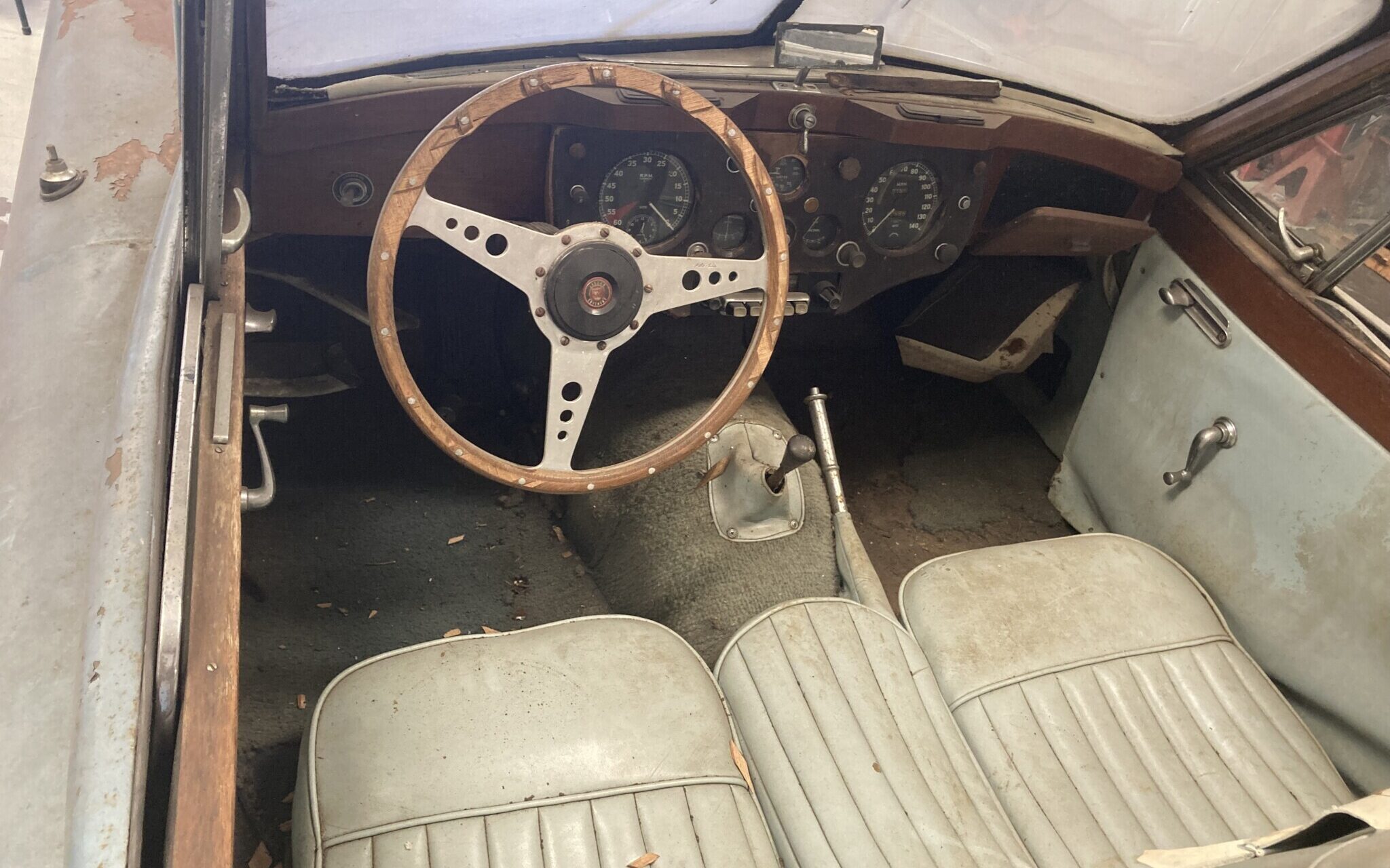 Documented as originally Suede Green inside and out, the body shows light blue over what might be silver paint. A four speed transmission with factory electric overdrive puts this Brit one or two notches up on most American cars of the day counting forward gears. American soldiers stationed in England returned with a love of lightweight British sports cars that opened doors to the diminutive roadsters back in “The Colonies.” While this Jaguar is hardly tiny, it wouldn’t fare well crashing into the average family car of Eisenhower’s USA.