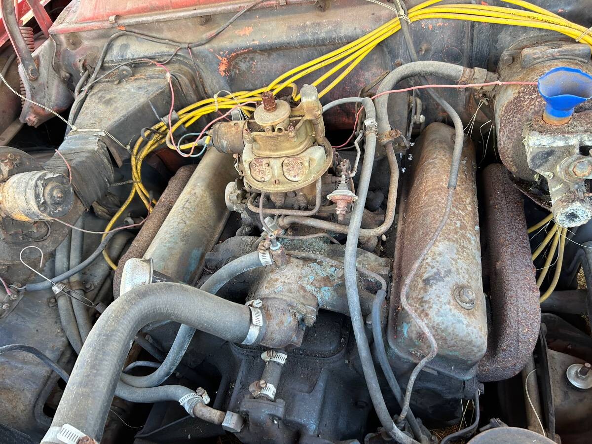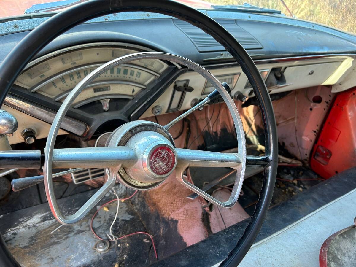 The red looks to have been applied in the last 30 years. The car looks to be pink originally. I would prefer a manual column shift. Cool spotlight side mirror