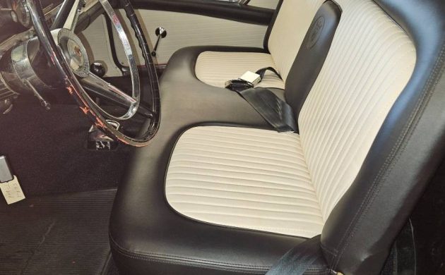 This Red ‘Bird was really red when it left Ford’s Dearborn Assembly Plant as the data plate shows Code XB, which was a red and white interior combination. Not that there’s anything wrong with red-on-red, but the ad says this Bird recently received a new black and white interior (Code XA) and it looks really sharp. The biggest differences from the ’55 interiors were the new “Deep-Center Lifeguard Steering Wheel” and a slight variation to the white pleated vinyl on the bench seat. Jerry describes the interior as nice but not show quality as the radio doesn’t work, there’s some age-related wear on the steering wheel, instrument panel and trim, and some pitting on the steering column’s chrome collar. And like the other T-Bird from this private collection I just wrote about (a black ’55), this ‘Bird is listed as having “manual steering and brakes, and front and rear anti-sway bars have been added to enhance handling.”