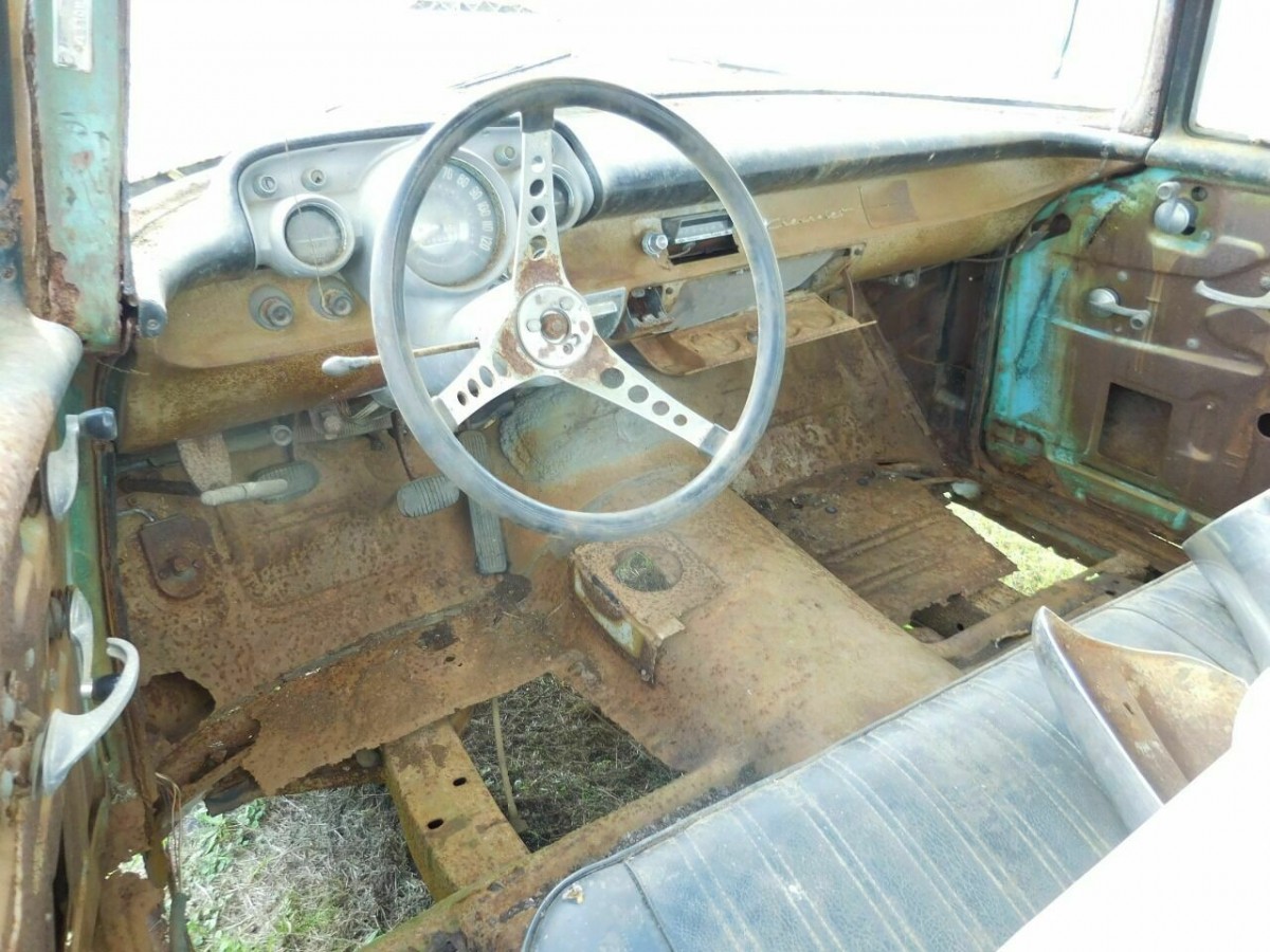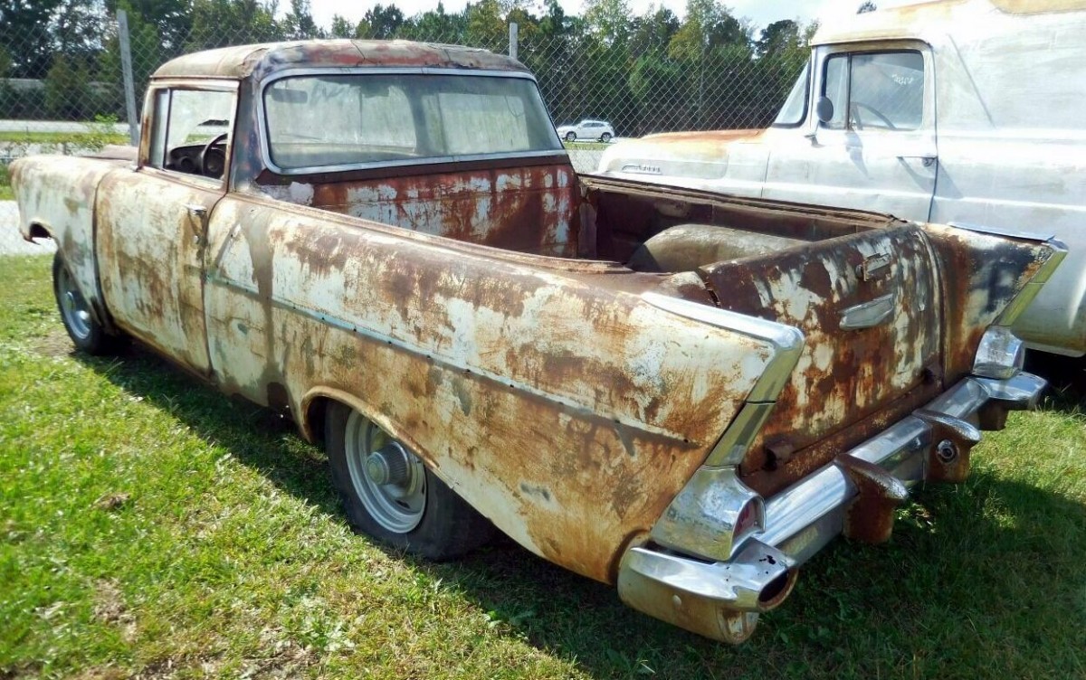 The 1957 Chevy at hand is said to have 66,000 miles on its odometer (which is almost impossible to read in the photos), but we don’t know how many of those miles may have been spent as a pickup, if any. No doubt inspired by the El Camino, a handyman himself who was apparently good working with sheet metal took off the roof behind the doors and turned this into a pickup. But it’s in rough shape now and far from complete. For example, it no longer has a motor or transmission, so we don’t know how it was equipped when it came off the assembly line. An inline six and three-on-the-tree would be a logical guess.
