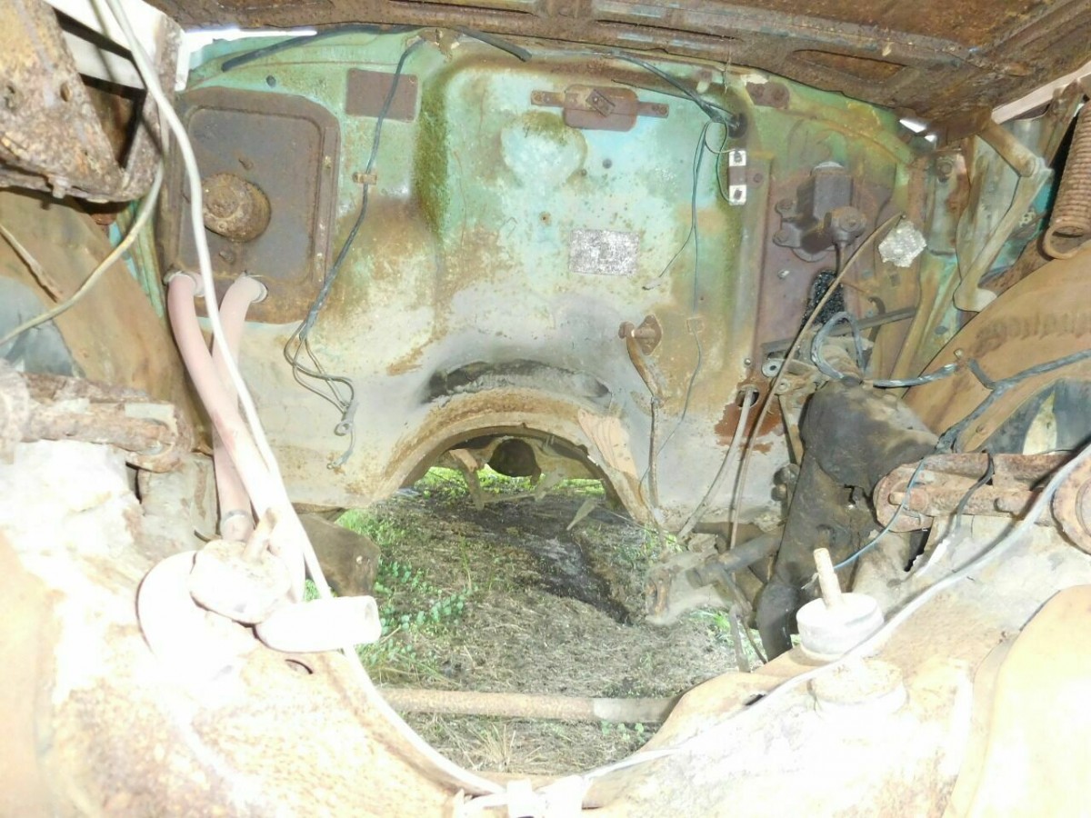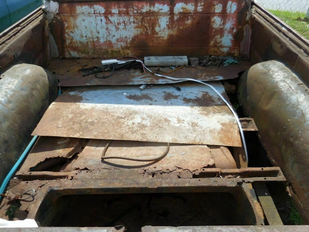 We’re guessing that if you don’t see it, it’s not there. Like a grille, front bumper, and the famous twin hood ornaments. At one time, the pickup was painted white and had a black interior, but there’s little left of either today. The windshield has a big hole in it and surface rust is very extensive, so it’s hard to tell what’s metal and what has morphed into corrosion. Some of the bed flooring is missing and there are holes in the floorboards, which would not be a big concern if you were Fred Flintstone. There is a bench seat in the passenger compartment, but it’s not period correct, comes with headrests and is just propped up rather than installed. On the plus side, the vehicle comes with a nice set of Rally wheels like I had on my 1970 Nova.