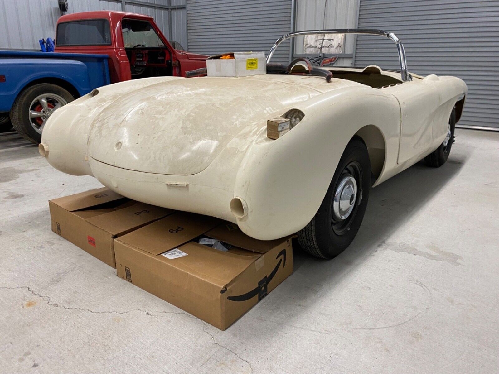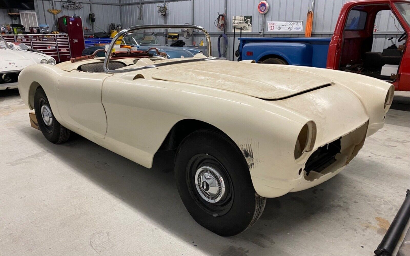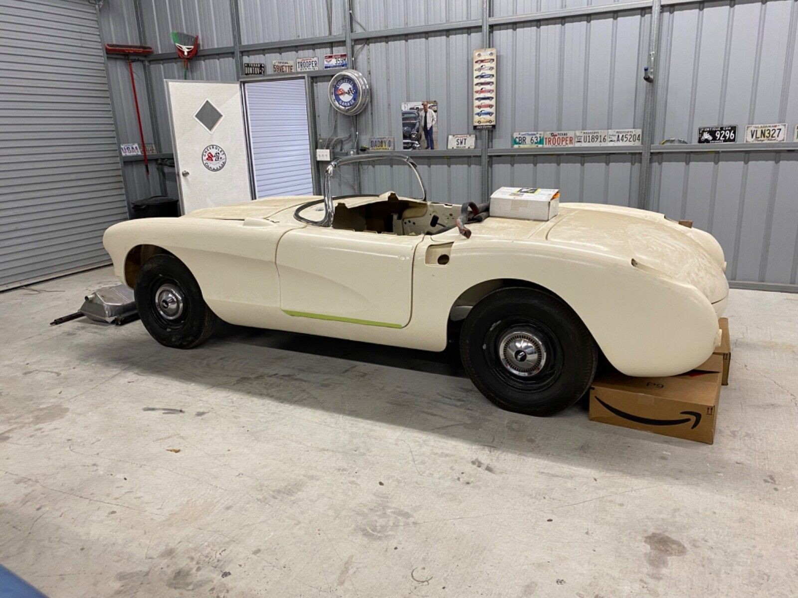 The body appears to be a Corvette Central Project 57 body. Project 57 was a correct 57 Corvette “kit” developed by Corvette Central years ago, feturing an accurate press molded fiberglass 57 body. From what I remember the idea behind it was to be able to build a brand new, exact replica 57 Corvette, including frame, trim, interior, etc, and not the typical kit car.