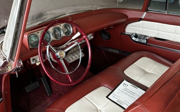 The owner is terse. “This 1957 Mark II was part of the J.C. Daniels collection in Pampa, Texas. It was sold by RM Auctions in 2007. My grandfather was the buyer, and I was with him at the time. He worked for Mr. Daniels in the 1940s at the latter’s Lincoln dealership. I have the RM paperwork and other documents from the auction that come with the car. I drove the car home that day and it has been stored inside our old Ford dealership since then.”There are only three photos, and they cover the bare essentials: exterior, interior and engine. The exterior shot makes plain that the car has, indeed, been sitting in a closed showroom on a main street. There’s a ton of unanswered questions. Has it moved since 2007? Was it started regularly? About all you can see is that the paint is either dulled or just very dusty, the interior appears very good and original, as that kind of two-tone upholstery was standard. The engine is, well, there.