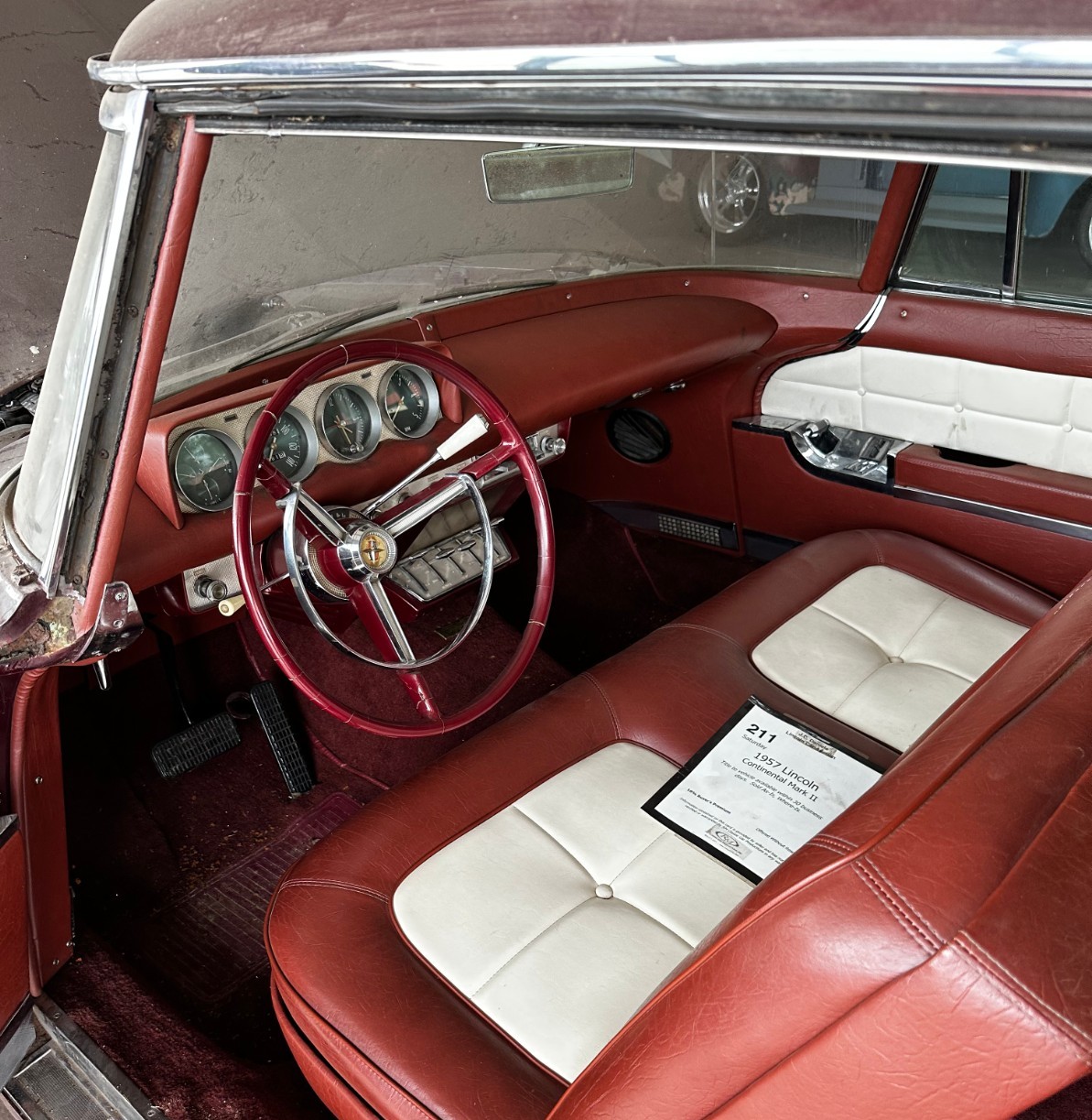 The owner is terse. “This 1957 Mark II was part of the J.C. Daniels collection in Pampa, Texas. It was sold by RM Auctions in 2007. My grandfather was the buyer, and I was with him at the time. He worked for Mr. Daniels in the 1940s at the latter’s Lincoln dealership. I have the RM paperwork and other documents from the auction that come with the car. I drove the car home that day and it has been stored inside our old Ford dealership since then.”There are only three photos, and they cover the bare essentials: exterior, interior and engine. The exterior shot makes plain that the car has, indeed, been sitting in a closed showroom on a main street. There’s a ton of unanswered questions. Has it moved since 2007? Was it started regularly? About all you can see is that the paint is either dulled or just very dusty, the interior appears very good and original, as that kind of two-tone upholstery was standard. The engine is, well, there.