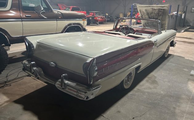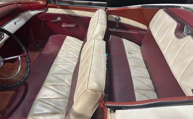 Not much history is given on this unique car. The seller believes the “conversion” may have been performed in the 1960’s, and a little online research showed that this retractable was for sale back in 2015 just before it was put into a museum. The front fascia is from a ’58 Edsel Pacer and the rear end treatment took some doing as it has the distinctive Edsel scallops on each side and the retrofitted boomerang taillights that were featured on the ’58 Edsel Roundup, Villager, and Bermuda station wagons. Overall, the body looks solid and the two-toned white and maroon paint looks very presentable (the 2015 for sale ad showed a photo with the car sporting a maroon retractable top). The chrome, glass, lenses, badging and trim look very good and I’ve always been a fan of those super-cool color-keyed spinner wheel covers.