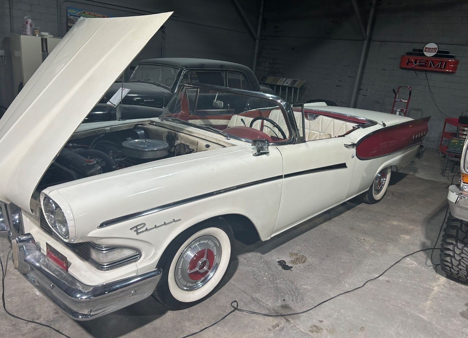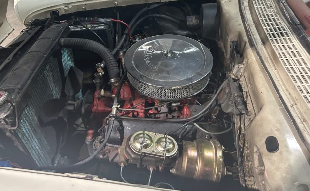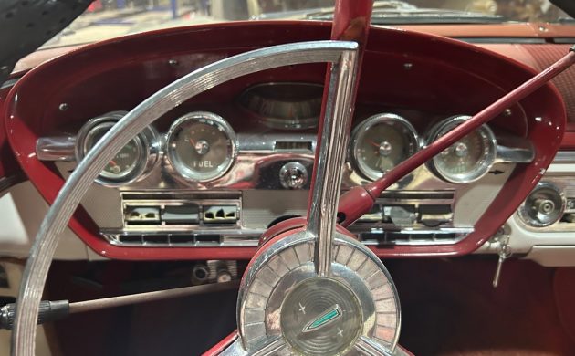 The color-coordinated interior appears to be in good shape and is a mish-mash of Edsel and Ford components. It has the instrument panel and dash from a ’58 Edsel, but has a column shift automatic (instead of Edsel’s gimmicky Teletouch push button transmission) and the steering wheel has a horn ring from a ’59 Edsel. The seller states, “the transmission does operate to move it. Everything does seem to work, except the top.”