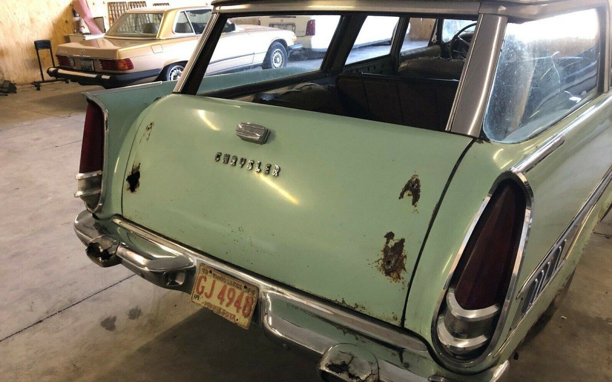 Missing the rubber guards on the tailgate; could be hard pcs. to locate but were shared with the other MoPar lines. The floor rot is concerning; depending on how extensive the damage, it could be a deal-breaker. Wow! The seats are nothing but a tattered rat’s nest! NOS material is available to reupholster, and it would be worth it. As scarce as the `57-`59 Chrysler wagons are, this is still worth restoring, but it won’t be cheap. The end result would be a stunning car younger people today have no idea ever existed!