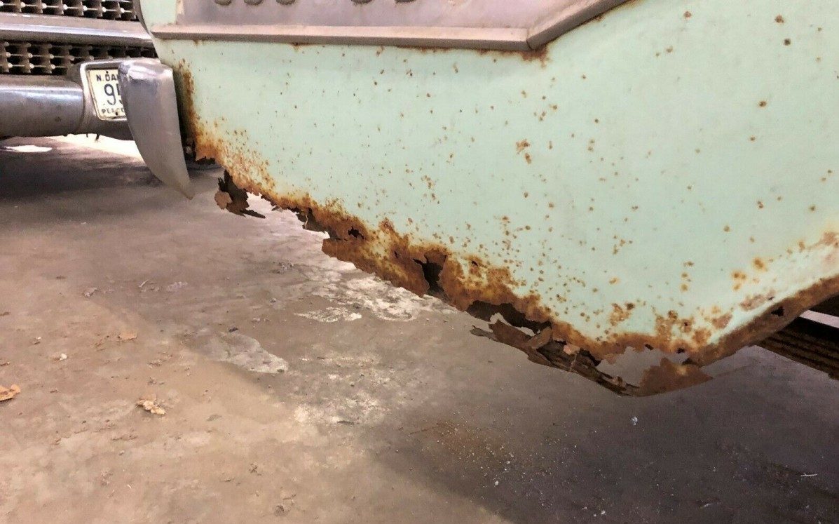 The exterior is a bit of a mixed bag. At a distance, it looks reasonable but close up you can see the damage. The seller advises, “Great bones, some floor and rocker replacement will be needed- This car has rust but overall is a great candidate for resto”. Followed with, “rear quarters as seen in pics need work”. The two-tone color scheme is great but the paint is a bit tired in places. Nevertheless, the oh-so fifties trim is mostly present and the extensive grille work still looks fantastic, surprisingly so.