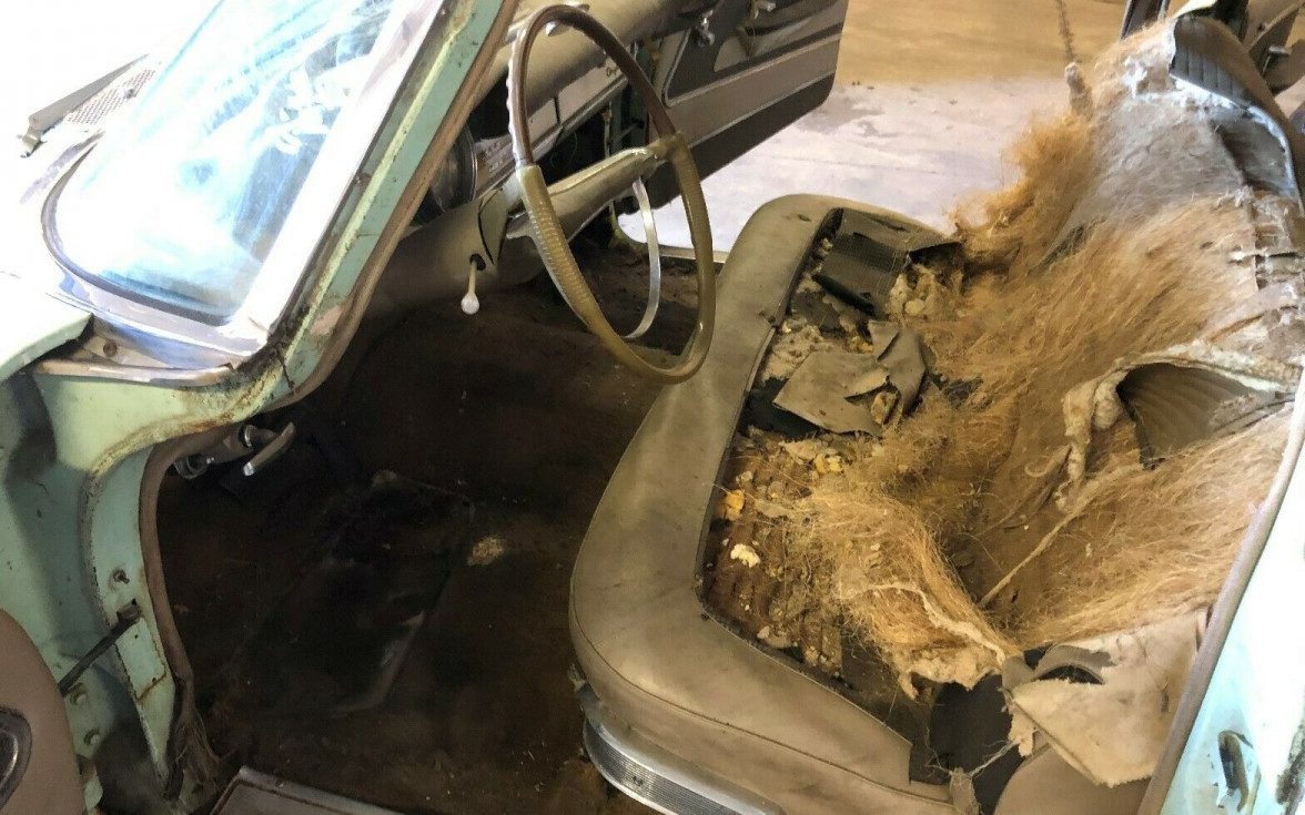 Wow, the impression you get from the first picture (I want that car!) is a lot different than the overall impression (RUN!).Interior probably wasn’t bad when parked, then some rodents had a field day. You can smell it from the pictures.