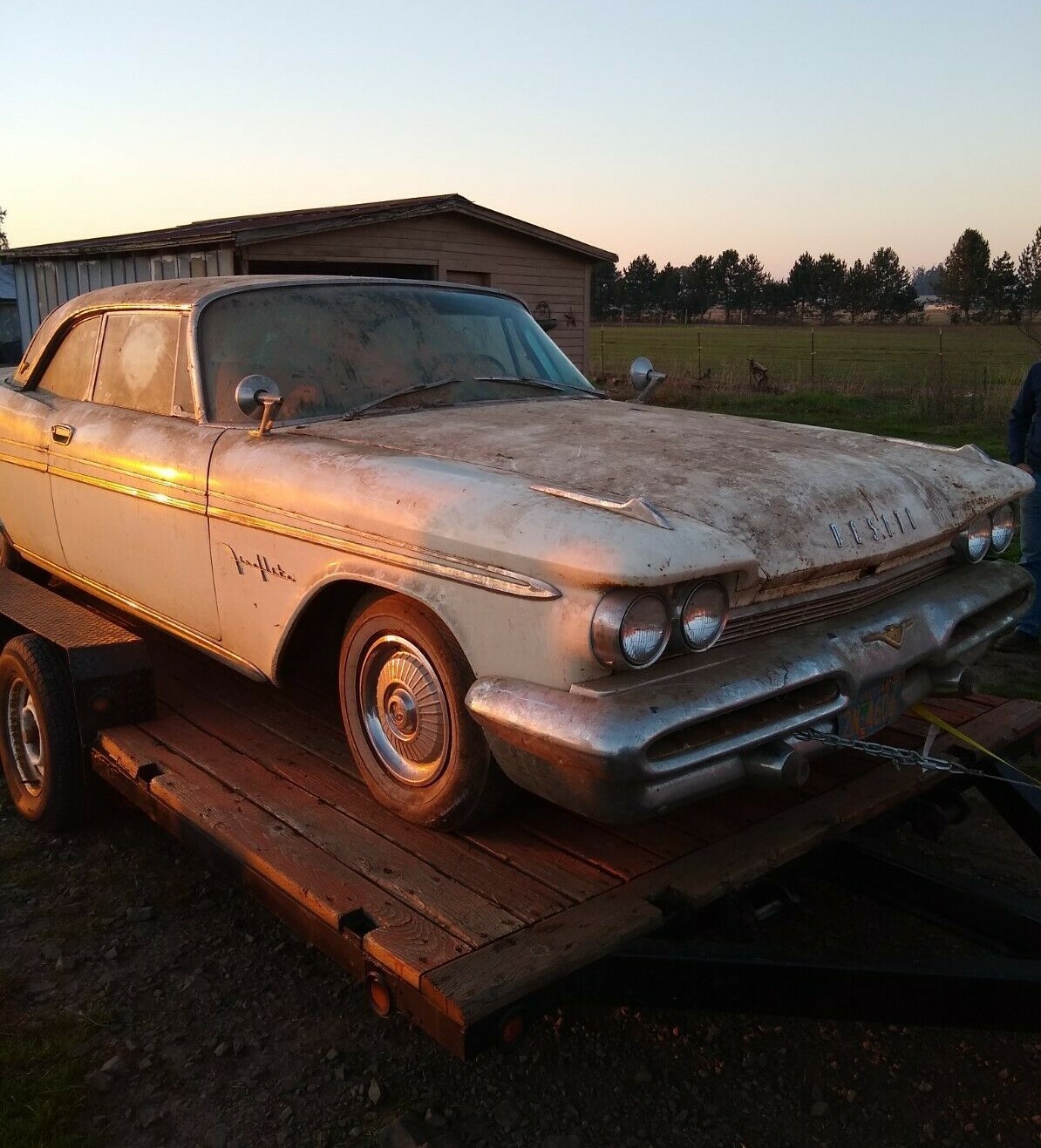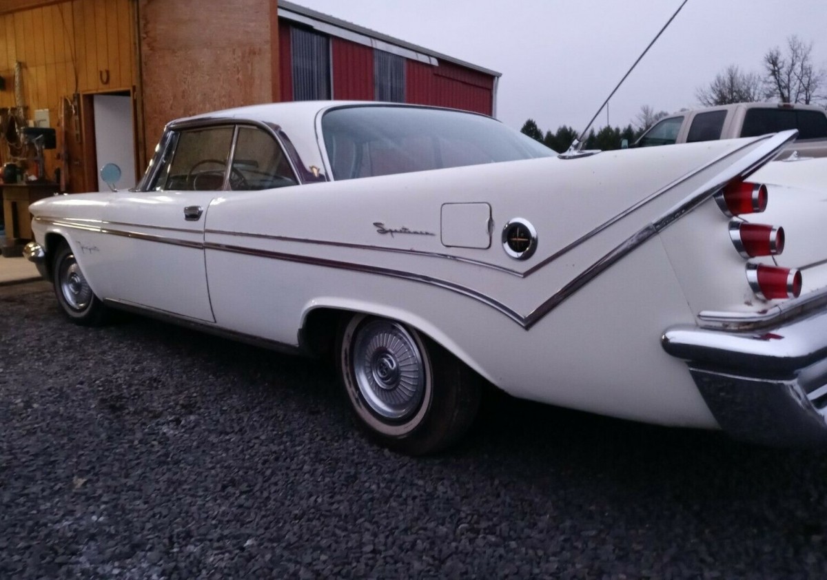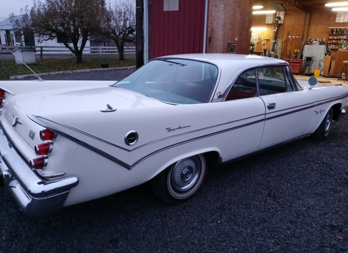 This 1959 Fireflite Sportsman (the designation for a 2-door hardtop) was recently pulled from a covered barn where it had been at rest for at least 30 years. It participated in a car show and then was promptly retired for reasons unknown. It still wears its factory Pearl White paint with surface rust in a few places and great chrome except part of the rear bumper. The rest of the body looks to be in good shape with no further mention of corrosion.