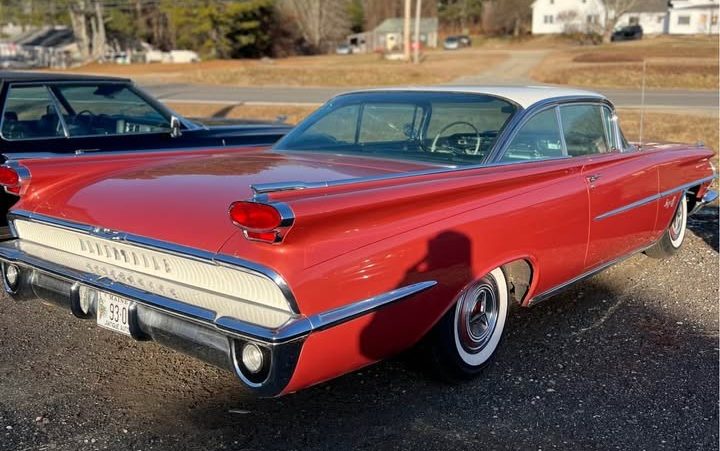 Is this the same car? A change of sun angle shows off the shine on this ’59. The rear-quarter view also highlights the 1959 Oldsmobile’s glorious fins, a one-year design before GM dialed back Fin Fever across its lineup for 1960. Tiny roof pillars vanished soon thereafter due to safety concerns. If you want the big fins and the wraparound greenhouse, it’s 1959 for you, Goldilocks. Longer rear bumper extensions and front fender callouts mark this as a Super 88, one step above the Dynamic 88. Oldsmobile called no-pillar ’59 two-doors SceniCoupe.