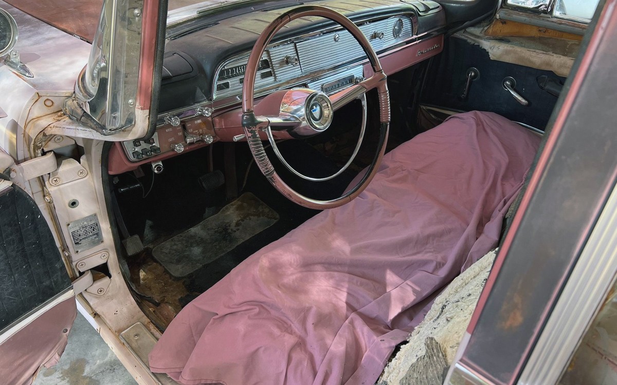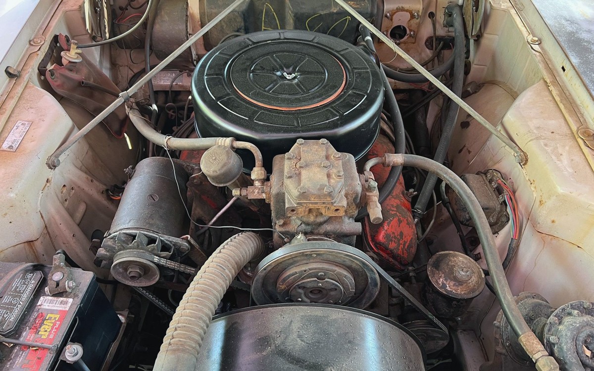 The interior is reportedly complete but in fairly rough shape, at least as far as fabrics and door panels go. There is heavy surface rust on the floors that will need to be taken care of before any fancy finishes can be replaced. The original seats will be nice to have as far as matching fabrics and patterns go and this car has factory air-conditioning! You’re in luck, SMS Auto Fabrics has at least some NOS replacements for this car, thankfully. The transmission should be a Borg-Warner three-speed pushbutton automatic.