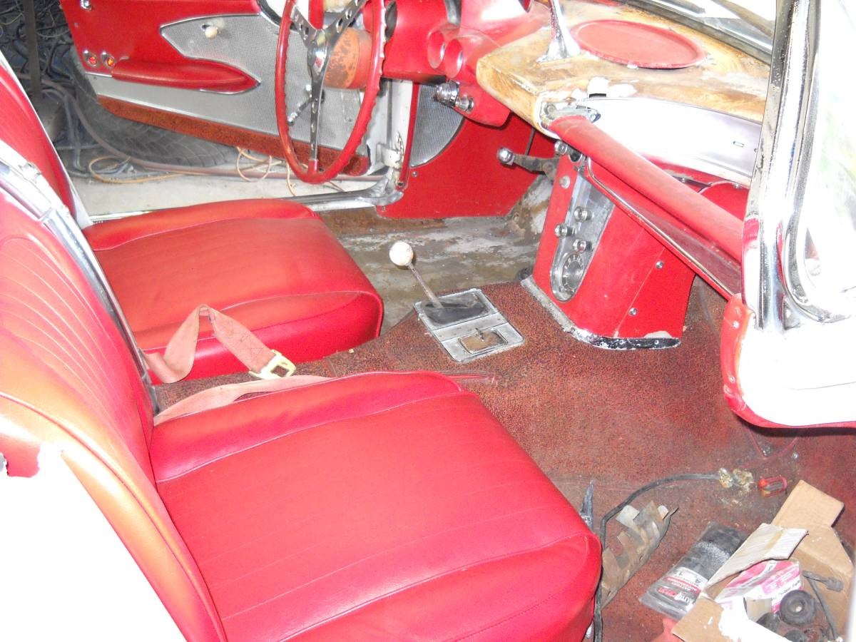 This Corvette is in good shape for being over 60 years old, but will definitely need a lot of work to bring it back to showroom condition. It comes with the original number’s matching 283 cubic inch engine and automatic 2 speed Powerglide transmission, as well as the original hard and soft tops. It also comes with a new carpet kit and dash pad. While we are not told if the seats and door panels are new or original, they look to be in great shape, as does the steering wheel and dash, with only very minor pitting visible on some of the trim.