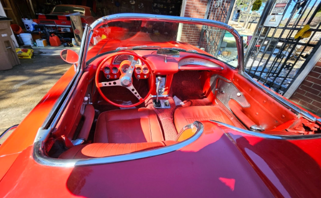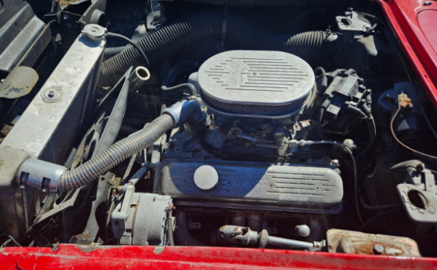 It’s a red-on-white-on-red sports car that’s a roller, although a non-working engine is under the hood. Some body work will be in order, followed by a new quality paint job. It, too, may have been in a parking lot skirmish, though likely minor. The interior looks good, though the frames to bolt in the seats are MIA. While the carpeting is good, the door panels are not. The hood had a hole for a supercharger, but the hood from the ’62 can replace it. A non-correct 327 sits below it and has Fuelie heads, but it’s not complete; a 4-speed manual tranny is along for the tour. An assortment of other parts is missing, like the gas tank.