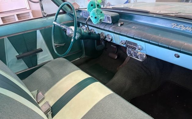 The exterior is described as being straight and pretty solid, which seems like a reasonable assessment, at least from what we can see in the photos. Some rust is specifically mentioned in the dog leg areas, but it appears minor, plus it looks like the rockers and a few of the other lower areas have already had some repairs made. I think that’s Aqua Green paint, a factory color on the Oldsmobile chart for ’61, which works really well with this body, especially with the white roof. It doesn’t seem like too much effort will be needed outside before this wagon’s ready for a respray.