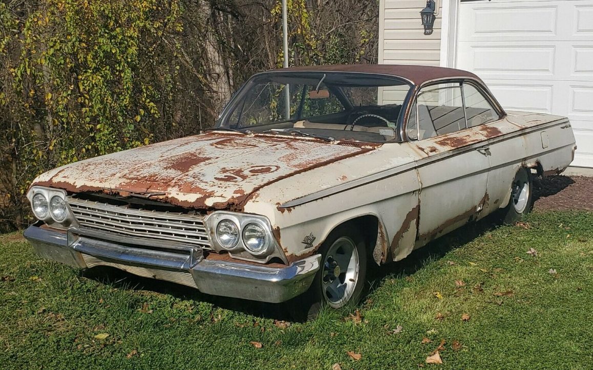 The full-size Chevies were redesigned in 1961 after two years of sporting batwings at the rear. The result was refined beauty that was further developed with the 1962 models, which are some of my favorites. One of the special cars from those two years was the ”bubble top,” a sport coupe with very thin rear pillars. In ’61, it was an Impala exclusive, while in ’62 it was moved to the Biscayne and Bel Air models to offer a dressy, sporty machine in a practical car. This 1962 Bel Air is one of those bubble tops with a transplanted 409 V-8, but the car sadly looks to be held together by rust. Fortunately, it comes with a plethora of replacement sheet metal and can be found in Forest Hill, Maryland. There has been no action at the starting bid of $9,500 here on eBay and the whole package can be secured for the Buy It Now price of $13,500.