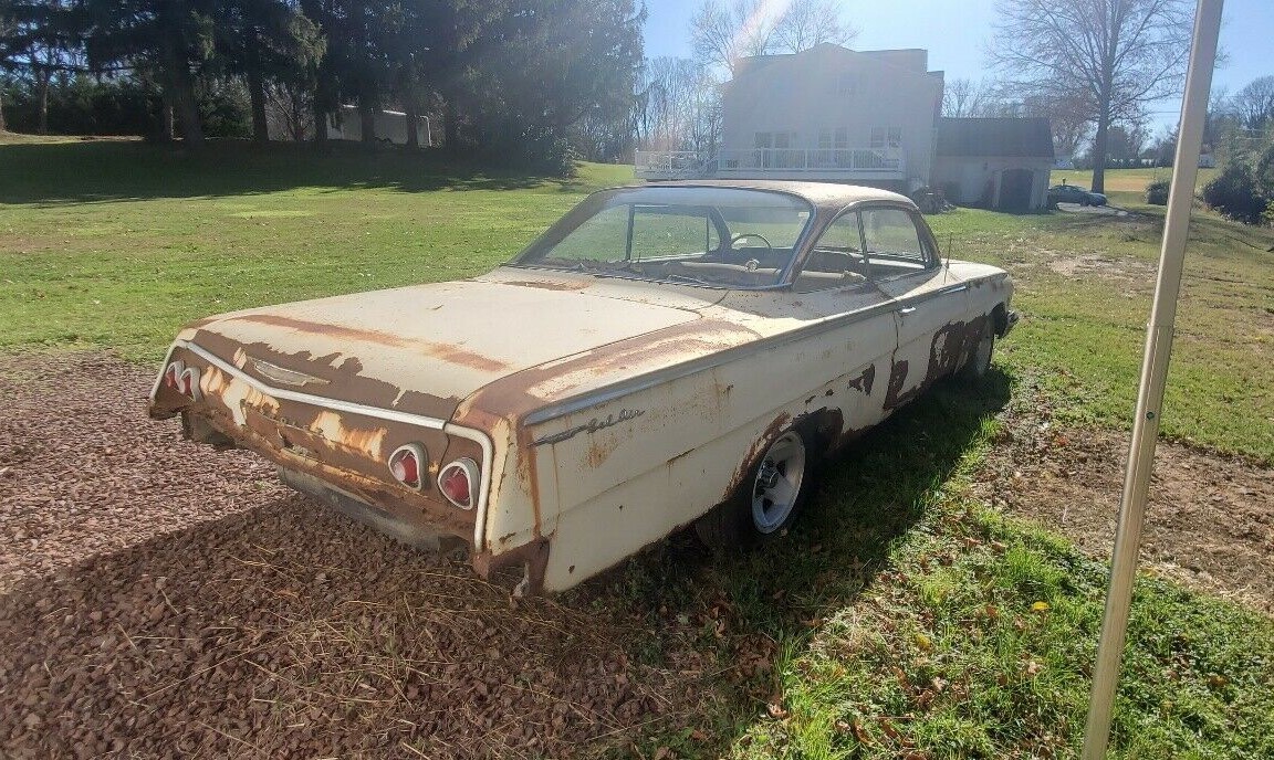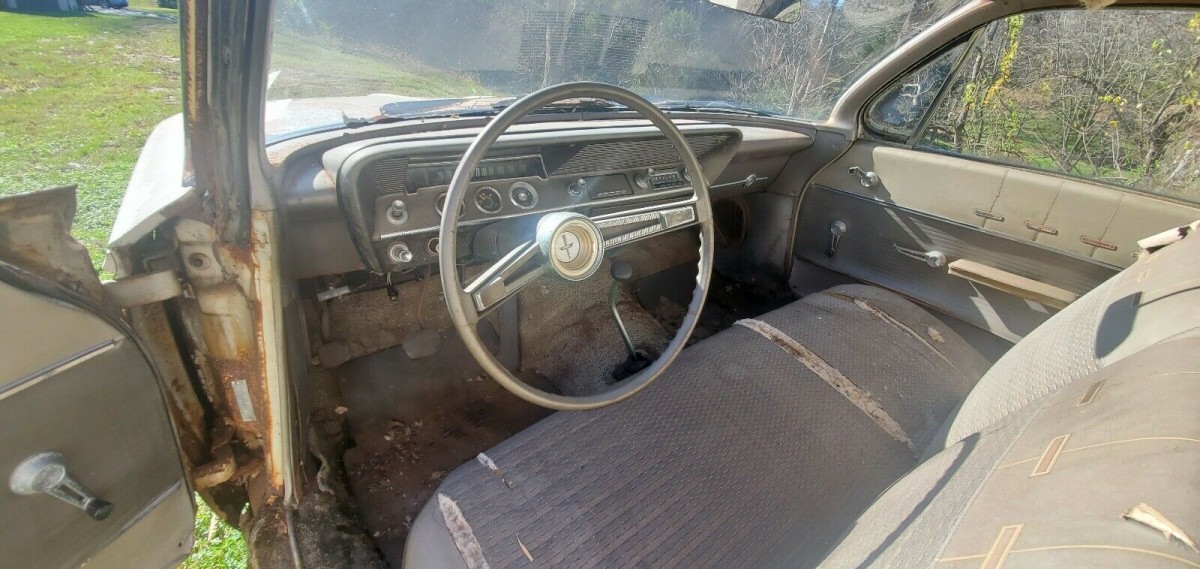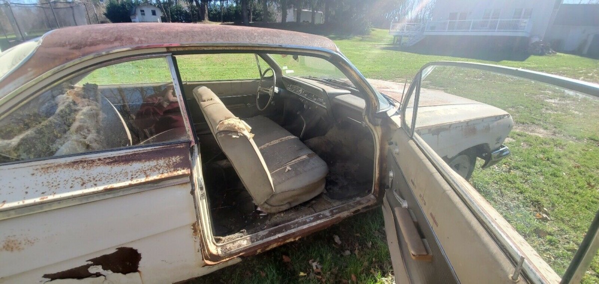 Much the sheet metal has been feasted upon by the dreaded tin worm and the frame is shot from sitting in out a field. So, the car will come with a bunch of new or replacement stuff to rectify that matter. This would include fenders, doors, trunk lid, and a one-piece floor system with supports. Since the frame is a goner, the seller has secured one from a 1963 409 car to use as a replacement. The side trim pieces are in decent shape but will need some re-anodizing. This is not a project for the faint-hearted and I’m not certain that every metal part you would need is there.