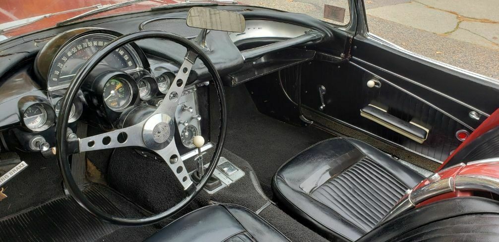 1962 also saw the introduction of the 327 C.I. engine, a displacement increase from the ’61 283 C.I. mill. Horsepower ratings ranged from 250 hp to 360 hp with the fuel-injected powerhouses. No mention in the ad which hp this engine is, though it’s probably the 250 or 300. The higher performance engines had the aluminum valve covers, but this also has a cast-iron intake manifold. So…? All the ignition shielding is intact, as well as the aluminum radiator and overflow tank. Looks like the fresh air hose is missing, though easily sourced from someone like Corvette America. It is said to run and drive great showing 32,242 miles.