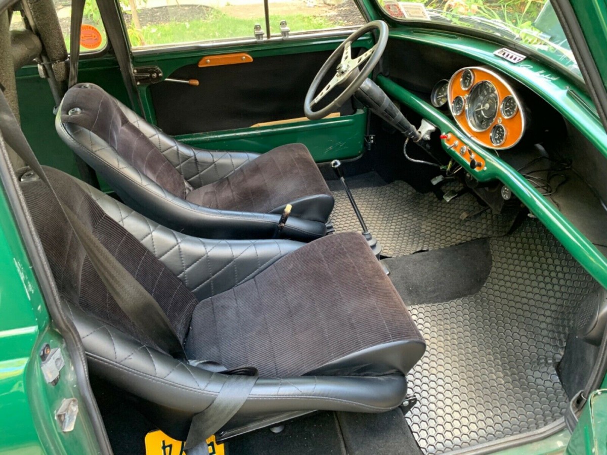 the 997cc cooper engine is very desirable, the 998cc engine is not, the flip front was common for either rust or accident repairs on the cheap, racing seats do not usually have headrests, many colours do not make it a race car! a fire system, sealed fuel tank, engine breather catch tank, date coded race belts etc. do……