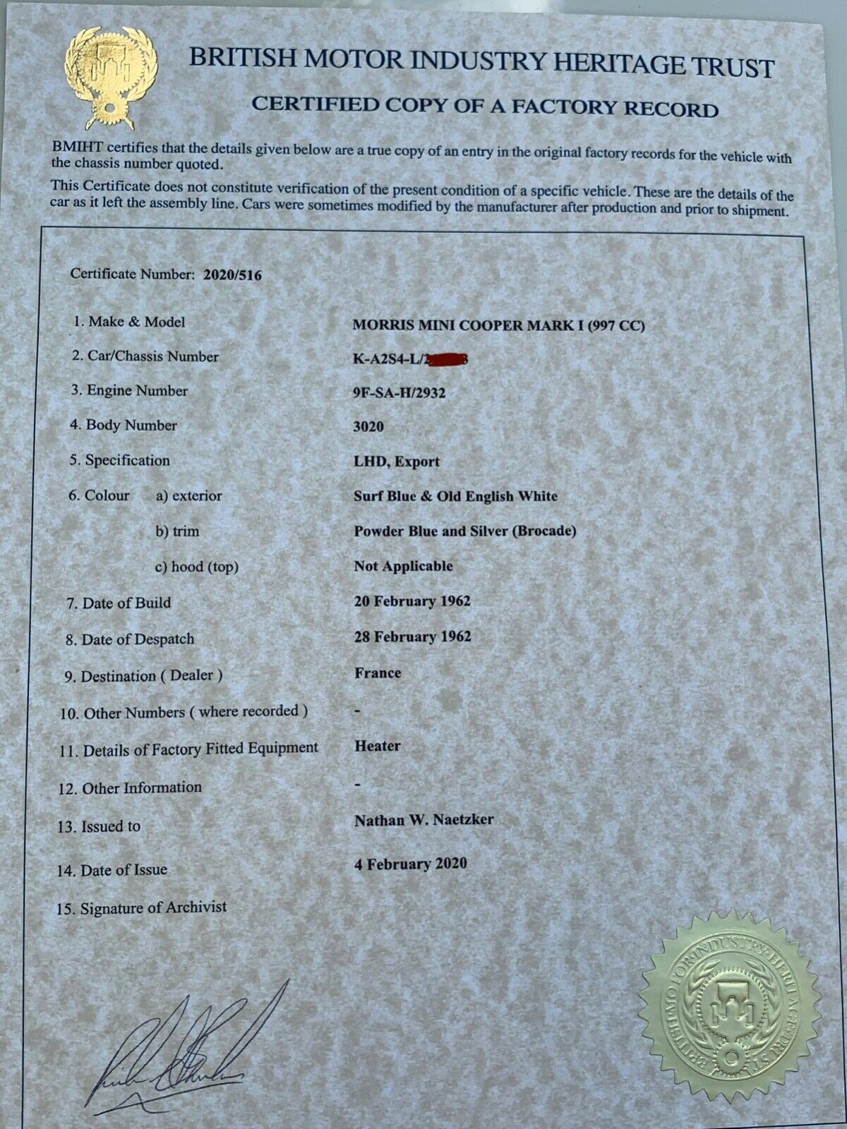 The journey from Britain to Buffalo has been a long one for this Mini. The route included some time in France before it found its way into Canada. From there, it made its way to its current location. The owner is pretty candid about this little classic and admits that the British Racing Green paint that it wears isn’t original. It actually started life finished in Surf Blue with an Old English White top. The owner estimates that the vehicle was repainted in its current color around 20-years-ago, but the paint has survived quite well. He also believes that the Mini may have had a competition history, because between the Green and Blue are several other colors. The Heritage Certificate proves that it is a real Cooper!
