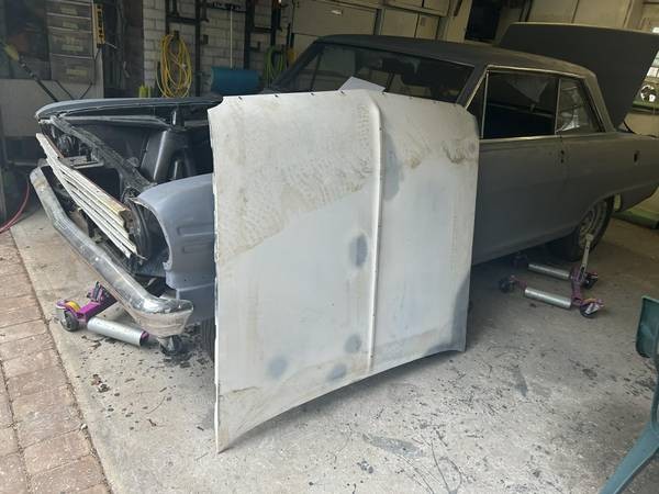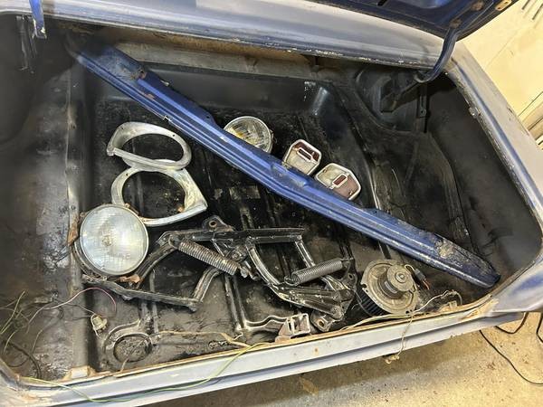 The Nova’s body looks straight, and it’s in primer, with $5,700 being asked. The chrome is half stripped off, and what’s left doesn’t appear to have been touched. The hood (detached) has had some work done. The engine (is there an engine?—not in the photos. The ad says the car is an eight-cylinder automatic with just 55,000 miles. The interior is stripped out, and also not in the photos. The head- and taillights are in the trunk.