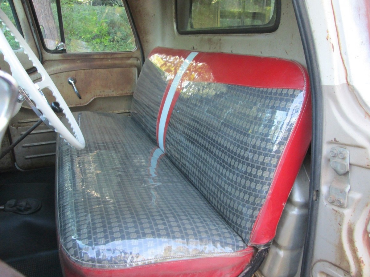 The engine has a long water pump, so it’s likely late model. There is no mention of it being rebuilt, only that it has a new carb. Could it be a spray painted 307 or 305? Neither of which would add much to the value of the truck. It’s also hard to believe the cloth interior would survive 50+ years of sitting in the sun without fading or degrading like the exterior finish.