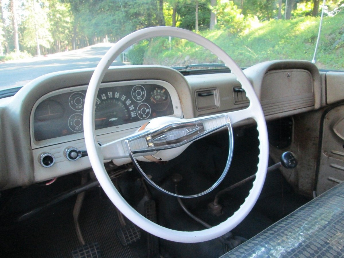 When I was a kid, a buddy’s dad had a ’62 Chevy C20 4×4 on his wheat farm here in Washington state. It was a six-cylinder and had a Farm Exempt sticker in the windshield, which meant he couldn’t drive it to town. He used it to haul diesel out to his D5 Cat or his combine in the field. I thought it was a really cool truck, and I was determined to get one when I was old enough to drive. Never got one. The closest I got to one was a ’61 Apache 10. It had the same steering wheel this one has.