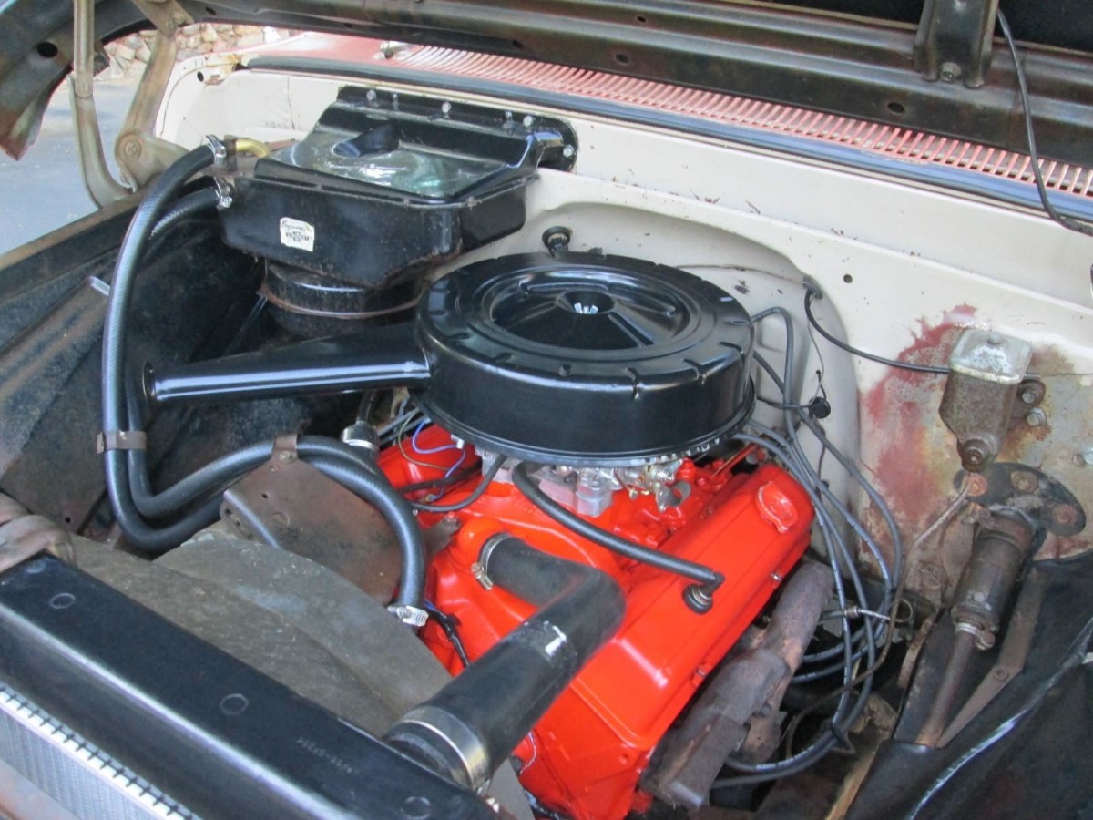 As Steve R. mentioned the engine is almost certainly a later model of who knows what displacement or year. Valve covers were stamped with Chevrolet through ’66, the oil fill tube was on the front of the intake manifold through ’68, and the wrap over alternator bracket was first used in ’73. But even with the unknown engine and drive train still a cool truck.